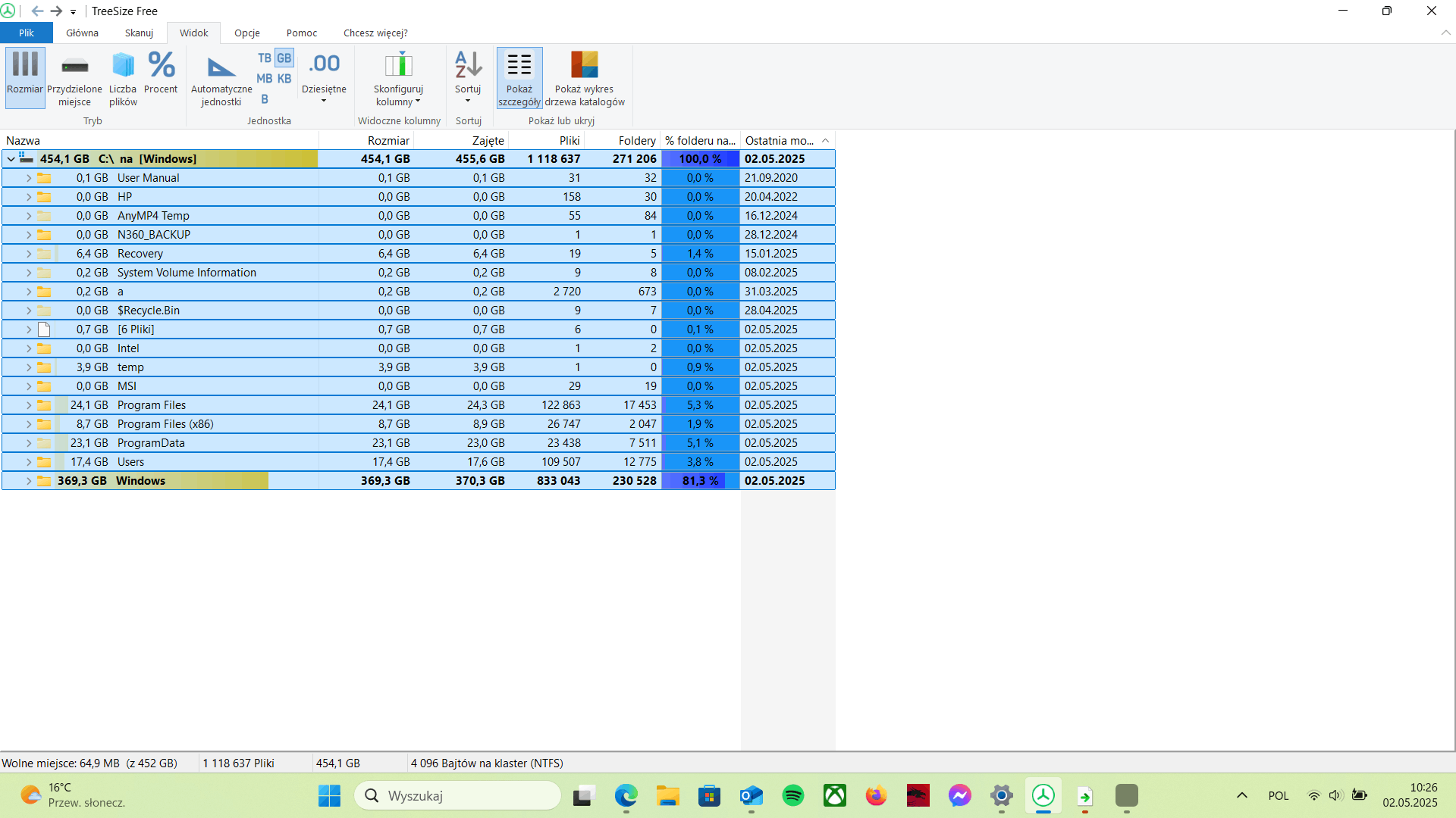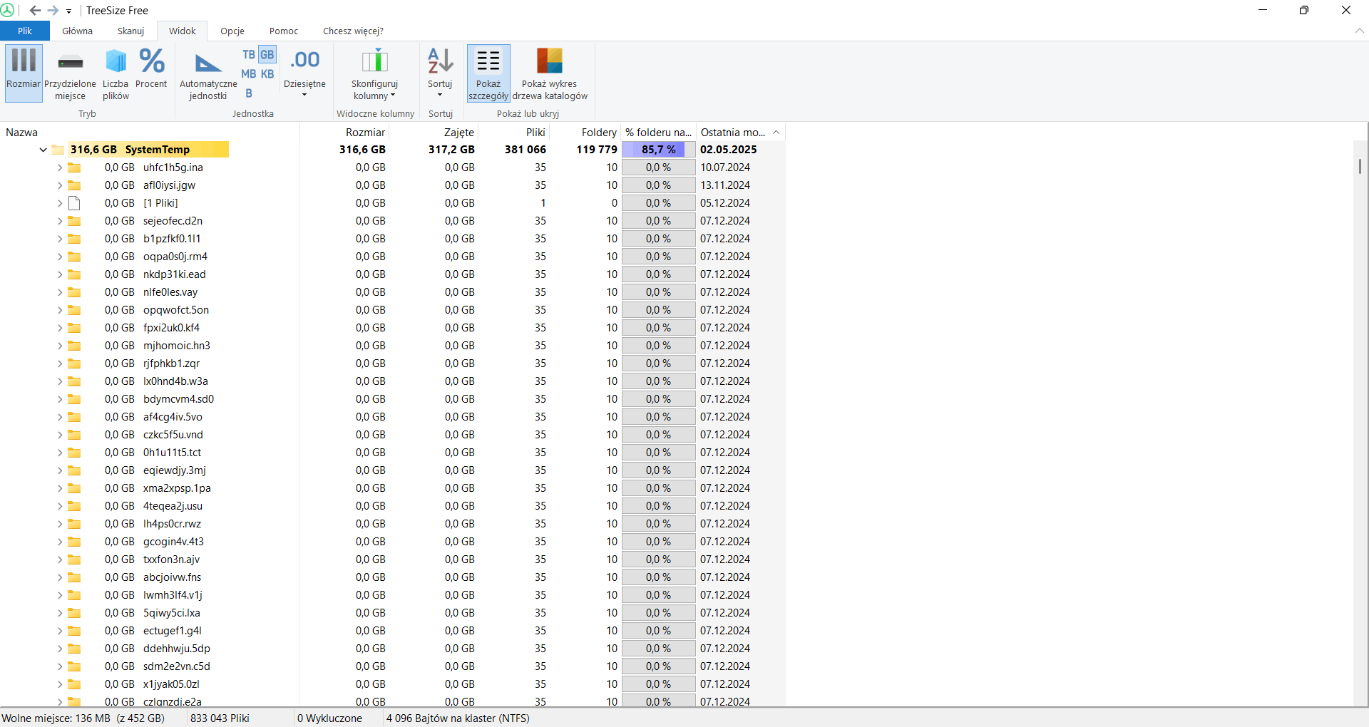 Prześlij zrzut ekranu całego dysku C w narzędziu TreeSize, a także kolejny zrzut ekranu danych znalezionych w folderze SystemTemp w aplikacji TreeSize, abym mógł zobaczyć, jakie dane są wyświetlone w tym folderze. Upewnij się również, że uwzględniłeś całe okno TreeSize, abym mógł zobaczyć dolny pasek w tym oknie.