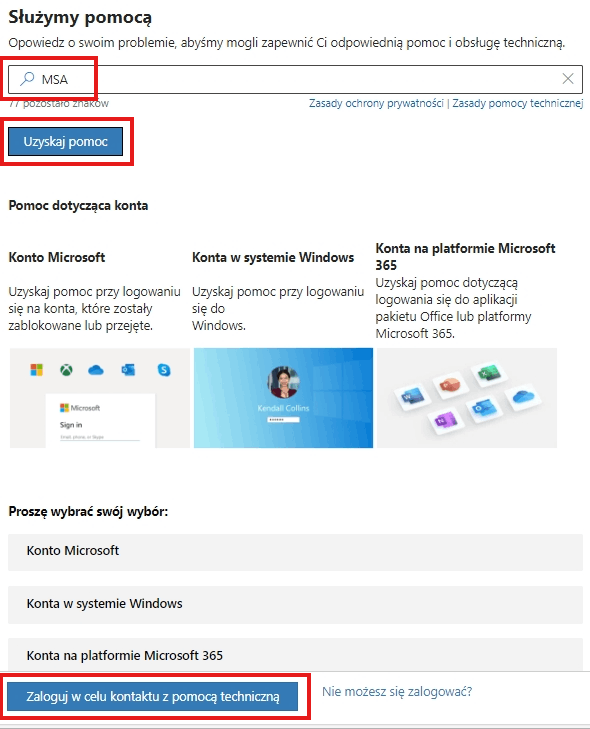 - Wpisz MSA w polu Wprowadź pytanie i kliknij Uzyskaj pomoc