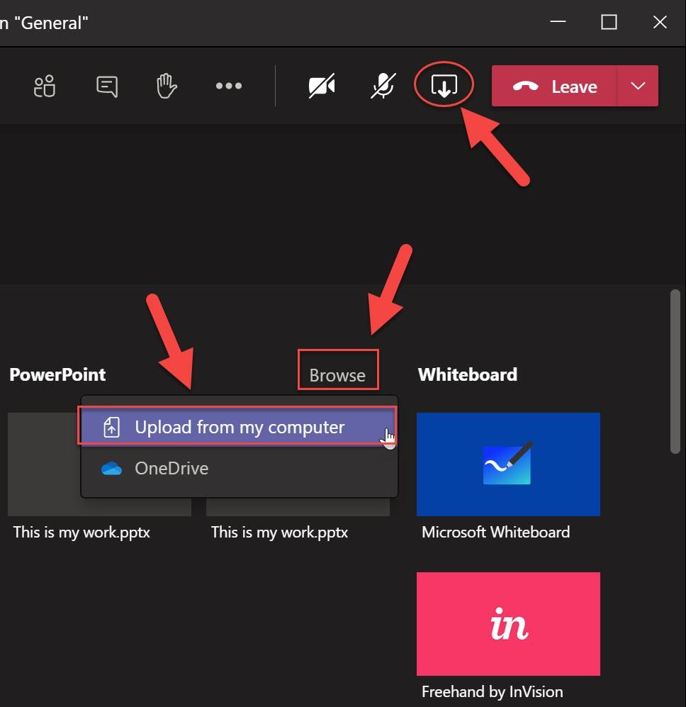 Jeśli próbujesz udostępnić pliki programu PowerPoint, możesz kliknąć ikonę zawartości udziału, > przeglądać > przesyłać z mojego komputera, niestety ta funkcja jest ograniczona tylko do pliku programu PowerPoint. Więc jeśli masz problem z plikami innych niż PowerPoint najwyraźniej trzeba ponownie uruchomić spotkanie.