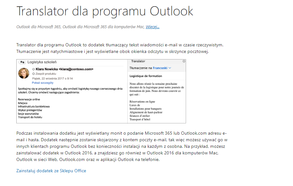 Dziękuję za odpowiedź. Wolałbym jednak otrzymać odpowiedź od przedstawiciela firmy Microsoft z jakimś wytłumaczeniem, dlaczego w Pomocy aplikacji Outlook dla komputerów Mac jest opisany sposób włączenia funkcji tłumaczenia a w rzeczywistości nie można wykonać opisanych tam czynności lub program nie działa tak jak powinien. W wielu miejscach w Internecie (linki otrzymane po kontakcie z pomocą telefoniczną z firmy Microsoft) jest napisane, że wersja Office 2016 dla komputerów Mac w tym także aplikacja Outlook obsługuje tłumaczenie tekstów na inne języki. W rzeczywistości tak się nie dzieje. Podobne opinie można znaleźć na stronie z której pobiera się wskazany przez firmę Microsoft dodatek do programu Outlook (Translator for Outlook) wśród opinii wystawionych przez innych użytkowników.