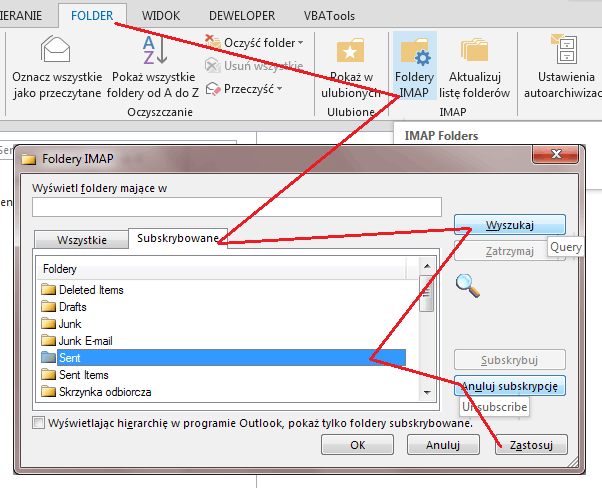 Nie robi się tego jednak na włączonym Outlooku, a z panelu sterowania/mail/konta zanim konto zacznie się synchronizować i powstaną standardowe podfoldery.