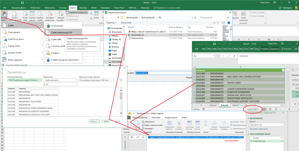 Zrobiłem skoroszyt importujący dane 4 plików z użyciem dodatku Power Query. Sa to dwa .XLS i dwa .TXT. Na bazie pobranych danych odbywa się porównanie cen z cenników (3 z nich) i porównywane są numery zamienne u różnych dostawców.