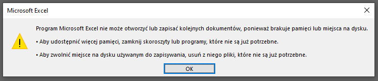 Pliki Excel'a wywalają się zarówno w trakcie odczytywania ich z poziomu programu pocztowego (Thunedrbird) jak i po zapisaniu na dysku (wolnego miejsca 7-8 gb, więc błąd który się pojawia jest jakimś kosmosem).