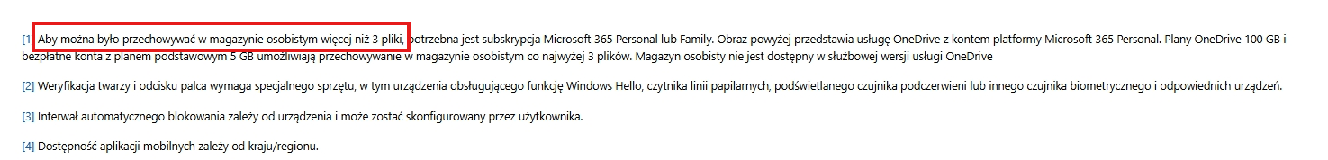 Z opisu wynika, że występujący problem może być spowodowany początkowymi ograniczeniami magazynu osobistego. Domyślnie magazyn osobisty może przechowywać tylko do 3 plików po odblokowaniu. Aby usunąć to ograniczenie, musisz ukończyć uwierzytelnianie (np. za pośrednictwem wiadomości SMS lub e-mail), a następnie magazyn osobisty udostępni łącznie 1 TB przestrzeni dyskowej w usłudze OneDrive.