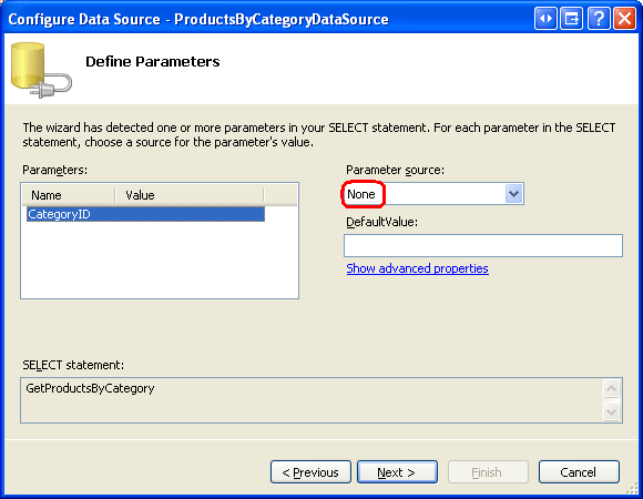Zacznij od dodania elementu GridView do strony i powiąż go z nowym elementem SqlDataSource o nazwie ProductsByCategoryDataSource. Podobnie jak w kroku 3, skonfiguruj SqlDataSource tak, aby wywoływał procedurę GetProductsByCategory składowaną. Pozostaw listę rozwijaną Źródło parametrów ustawioną na Brak, ale nie wprowadzaj wartości domyślnej, ponieważ ustawimy tę wartość domyślną programowo.