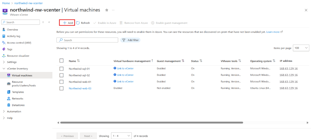 Wybierz Azure Arc jako usługę. W obszarze Środowiska hosta wybierz pozycję VMware vCenters. Wyszukaj i wybierz swoje VMware vCenter. Wybierz pozycję Maszyny wirtualne w obszarze spisu programu vCenter w bloku po lewej stronie i wybierz pozycję Dodaj.