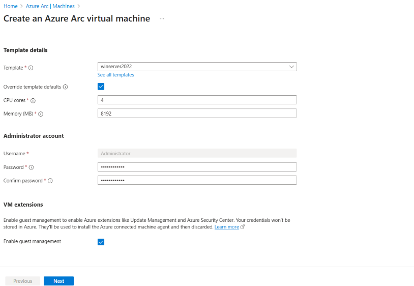 Pozostaw zaznaczone pole wyboru Włącz zarządzanie gościem , aby automatycznie zainstalować agenta połączonej maszyny platformy Azure natychmiast po utworzeniu maszyny wirtualnej. Agent połączonej maszyny platformy Azure (agent arc) jest wymagany, jeśli planujesz używać usług zarządzania platformy Azure do zarządzania, stosowania poprawek, monitorowania i zabezpieczania maszyny wirtualnej za pośrednictwem platformy Azure.