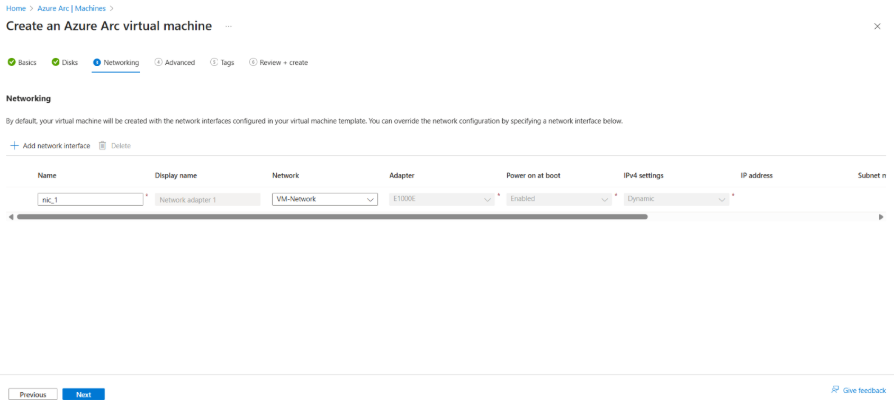 W obszarze Sieć możesz opcjonalnie zmienić interfejsy sieciowe skonfigurowane w szablonie. Możesz dodać karty interfejsu sieciowego (karty sieciowe) lub zaktualizować istniejące karty sieciowe. Możesz również zmienić sieć, do której jest podłączona ta karta sieciowa, jeśli masz odpowiednie uprawnienia do tego zasobu sieciowego.