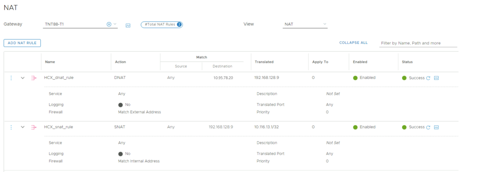 Dodaj jedną regułę SNAT i jedną regułę DNAT dla menedżera HCX.