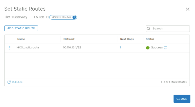 Statyczna trasa null jest używana do kierowania prywatnego adresu IP HCX przez poziom 1 NSX do publicznych punktów końcowych. Ta trasa statyczna może być domyślnym routerem warstwy 1 utworzonym w chmurze prywatnej lub utworzyć nowy router warstwy 1.