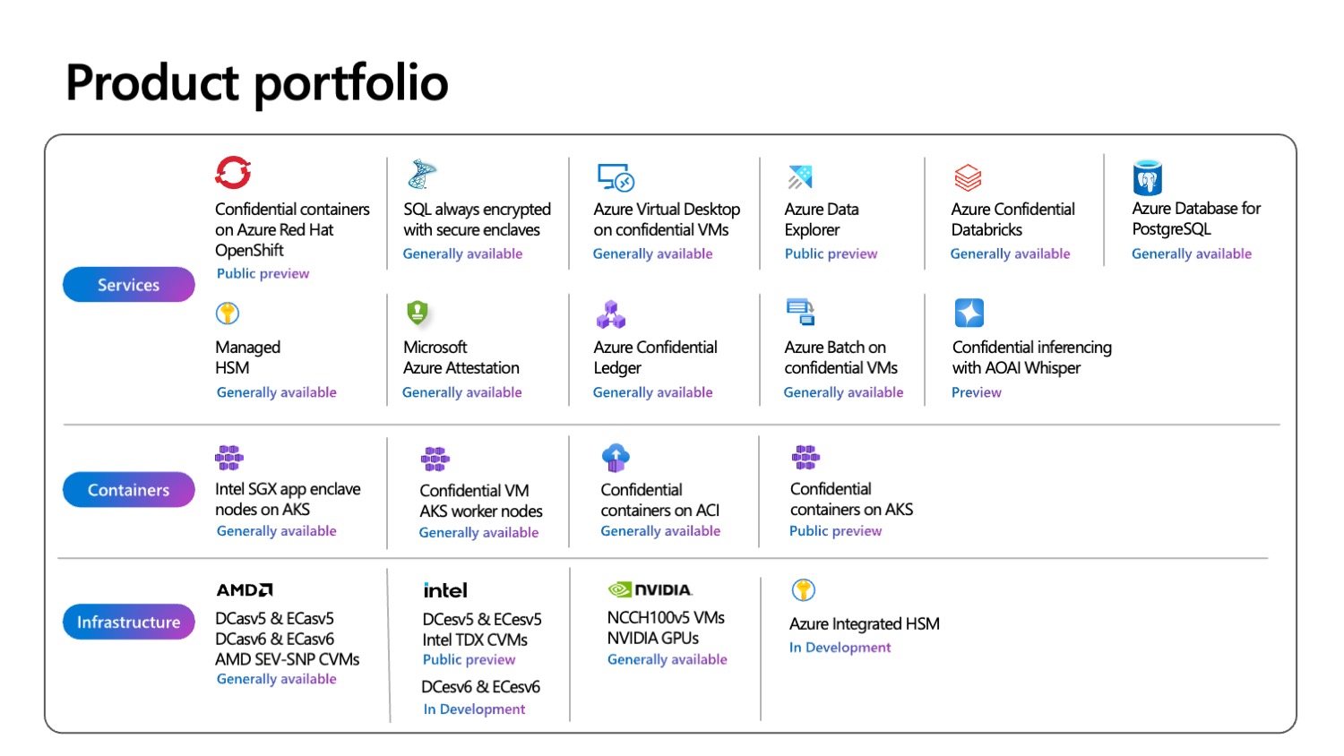 Oferty poufnego przetwarzania na platformie Azure obejmują maszyny wirtualne i kontenery, usługi i oferty uzupełniające.