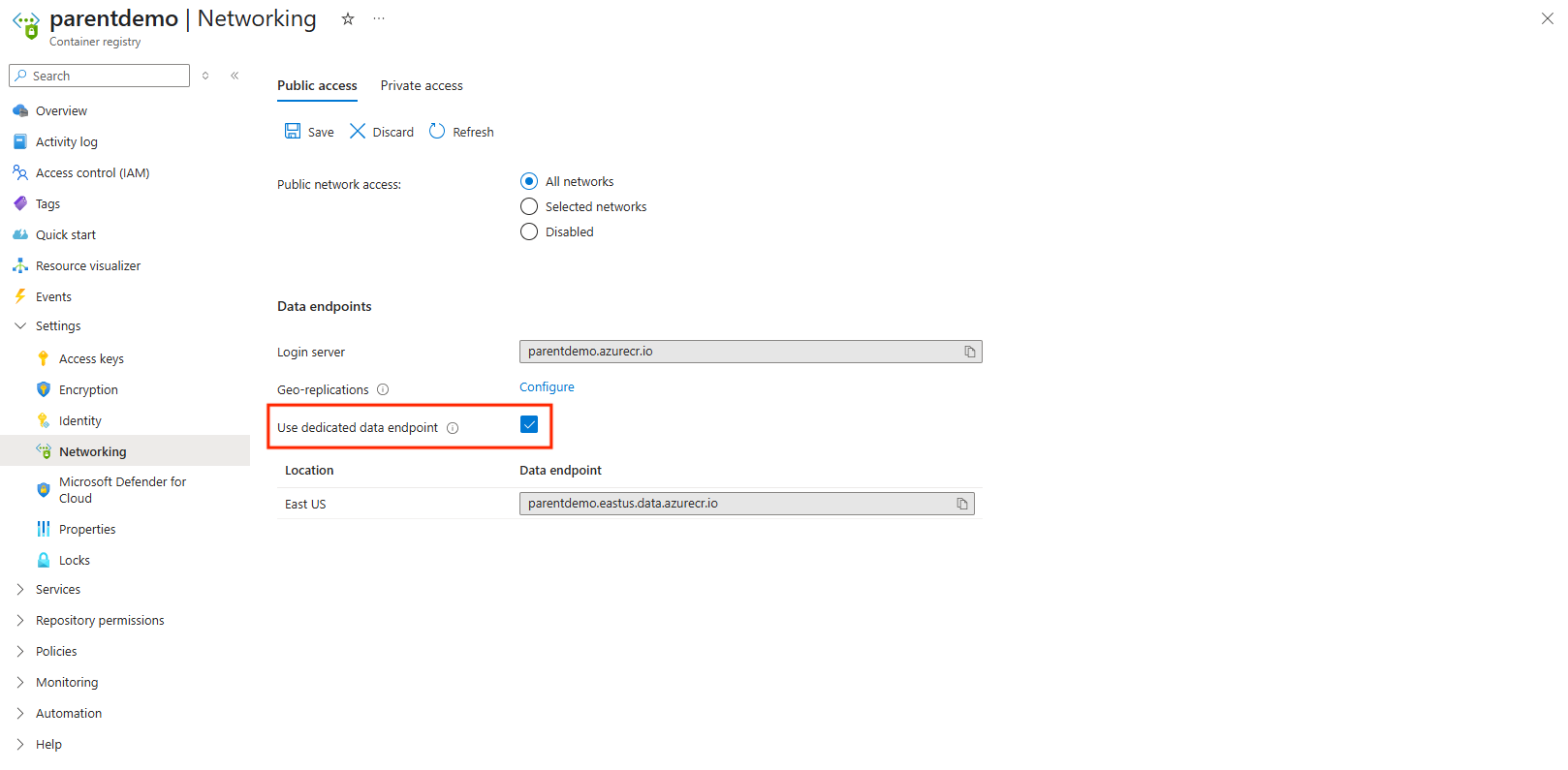 Włącz dedykowany punkt końcowy danych dla rejestru kontenerów platformy Azure w chmurze. Ten krok jest wymagany, aby połączony rejestr komunikował się z rejestrem w chmurze.