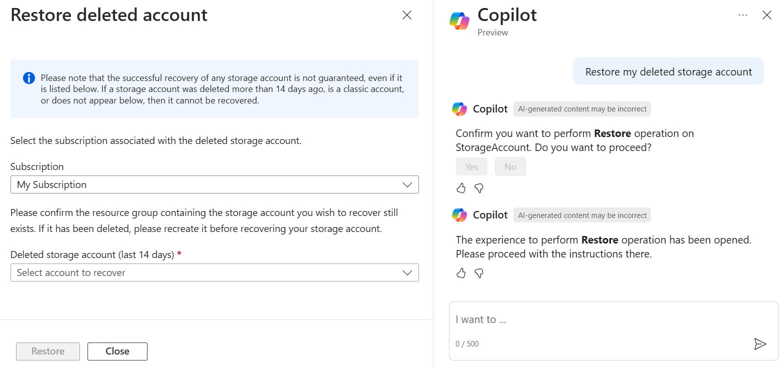 Kiedy powiesz "Przywróć usunięte konto magazynu", narzędzie Azure Copilot umożliwia korzystanie z funkcji Przywrócone usunięte konto. Tutaj możesz wybrać subskrypcję i konto magazynu, które chcesz odzyskać.