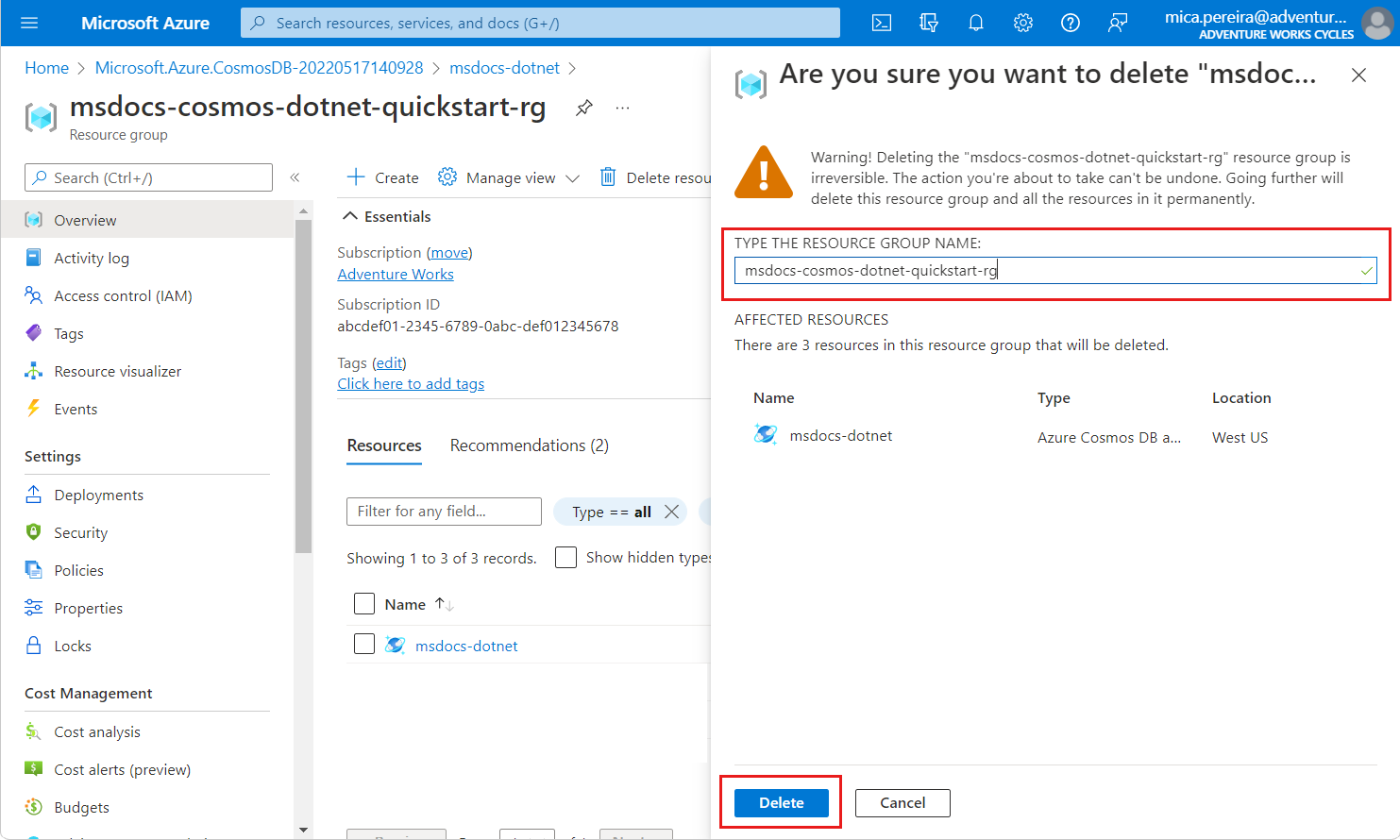 Jeśli nie potrzebujesz już interfejsu API dla konta NoSQL, możesz usunąć odpowiednią grupę zasobów.