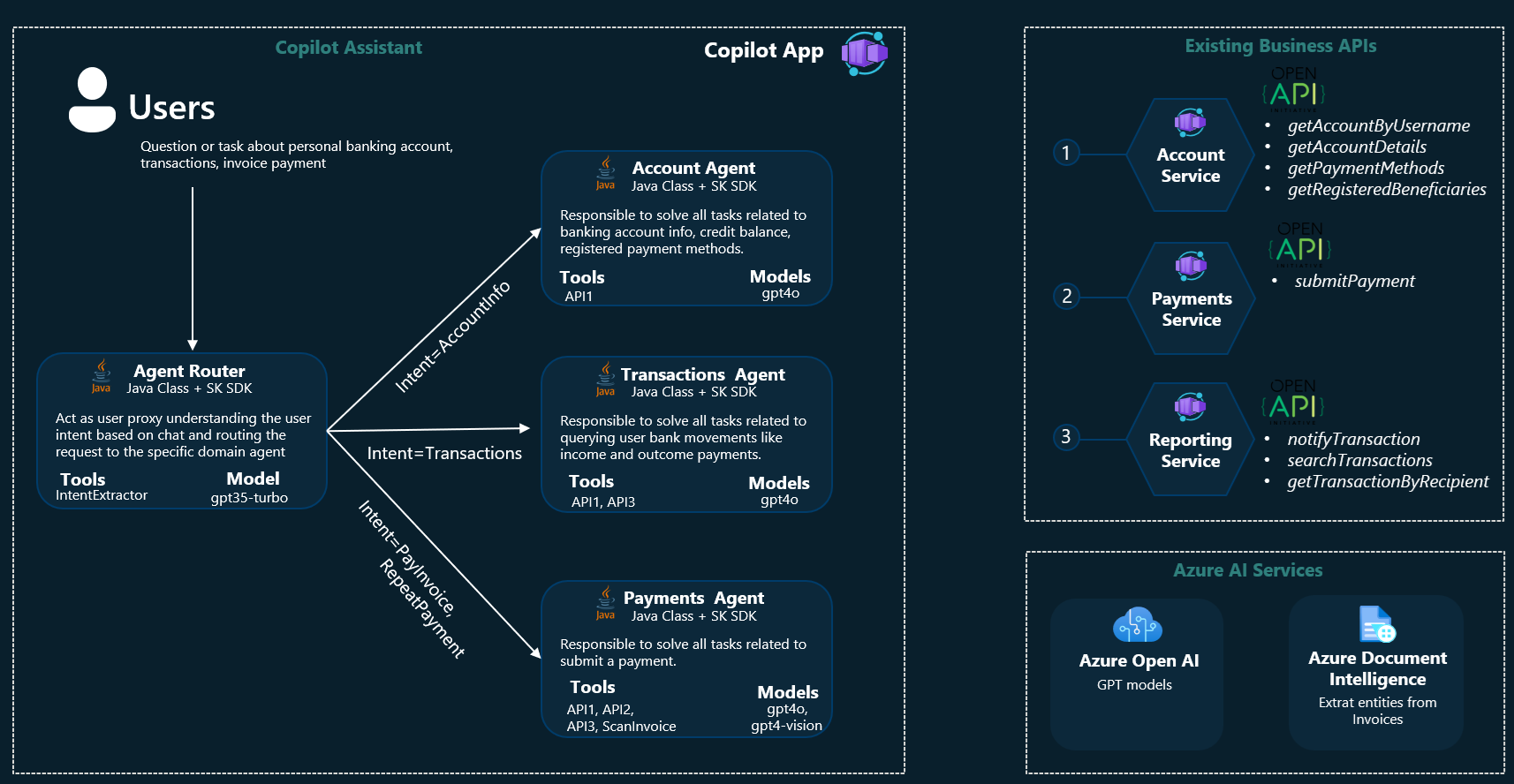 Ten projekt został zaprojektowany jako weryfikacja koncepcji (PoC) w celu zbadania innowacyjnego obszaru generowania sztucznej inteligencji w kontekście architektur wielu agentów. Wykorzystując Java i platformę aranżacji sztucznej inteligencji firmy Microsoft Semantic Kernel, naszym celem jest utworzenie aplikacji internetowej czatu w celu zademonstrowania możliwości i niezawodności korzystania z agentów generacyjnych sztucznej inteligencji w celu przekształcenia środowiska użytkownika z kliknięć internetowych do konwersacji w języku naturalnym przy jednoczesnym maksymalizacji ponownego użycia istniejących danych obciążeń i interfejsów API.