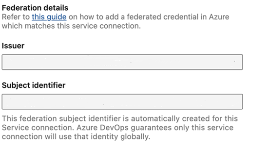 Podobnie, podczas tworzenia połączenia usługi za pomocą dostawcy Terraform azuredevops, zasób azuredevops_serviceendpoint_azurerm zwraca atrybuty workload_identity_federation_issuer i workload_identity_federation_subject.