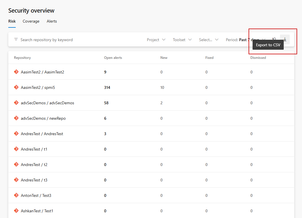 Teraz możesz wyeksportować wyniki z przeglądu zabezpieczeń do pliku CSV. Zarówno widoki ryzyka, jak i pokrycia obsługują eksportowanie, zapewniając możliwość pobrania migawki stanu zabezpieczeń organizacji w repozytoriach. Nowa strona Alerty, która zapewnia wgląd w określone alerty w całej organizacji, będzie również obsługiwać funkcjonalność eksportu z maksymalną liczbą 1000 eksportowanych alertów.