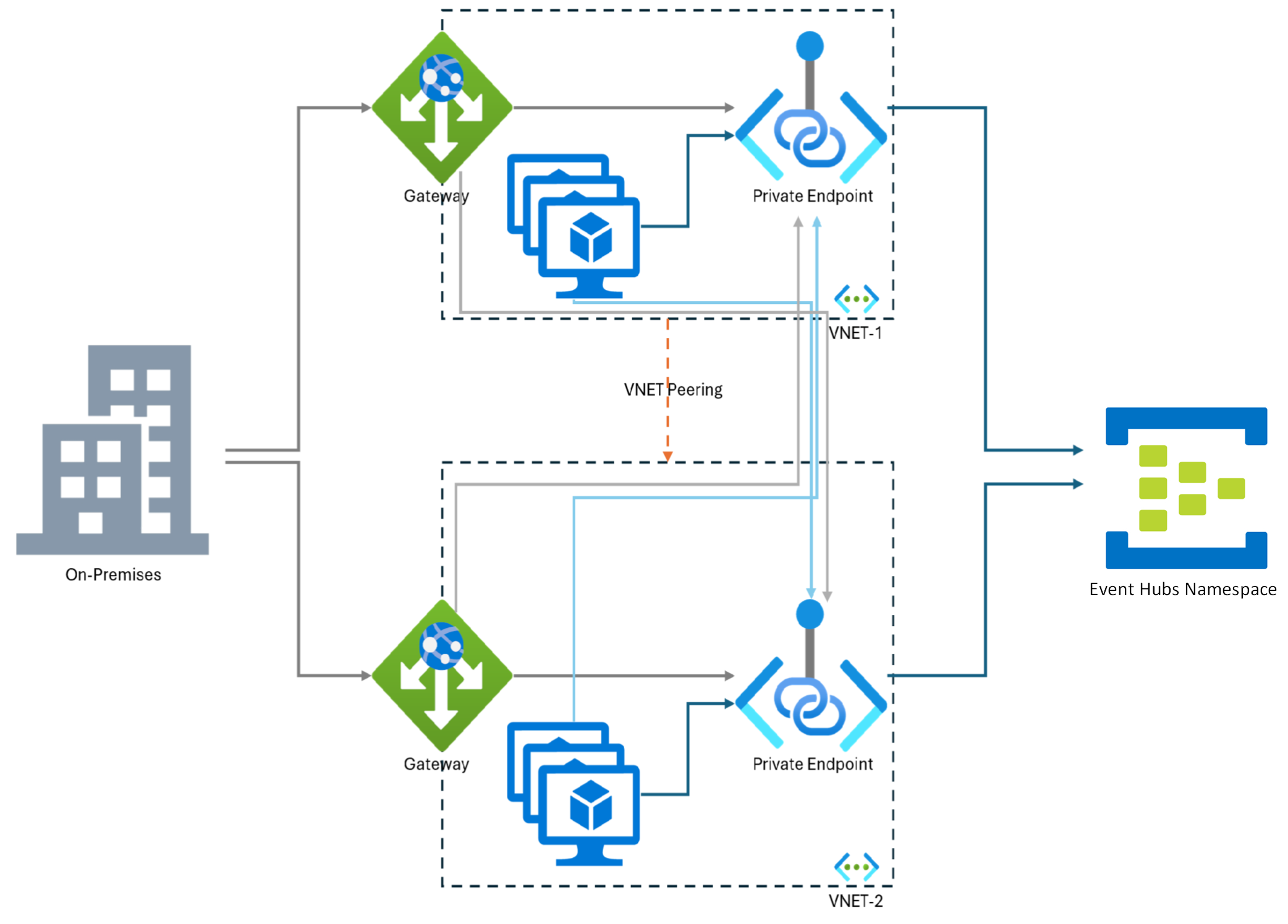 Podczas implementowania Geo-Replication dla przestrzeni nazw usługi Event Hubs korzystającej z prywatnych punktów końcowych ważne jest utworzenie prywatnych punktów końcowych zarówno dla regionów podstawowych, jak i pomocniczych. Te punkty końcowe powinny być skonfigurowane względem sieci wirtualnych hostujących zarówno podstawowe, jak i pomocnicze instancje aplikacji. Jeśli na przykład masz dwie sieci wirtualne, VNET-1 i VNET-2, musisz utworzyć dwa prywatne punkty końcowe w przestrzeni nazw usługi Event Hubs, używając odpowiednio podsieci z sieci VNET-1 i VNET-2. Ponadto sieci wirtualne powinny być konfigurowane za pomocą peeringu między regionami, aby klienci mogli komunikować się z dowolnym z prywatnych punktów końcowych. Na koniec DNS musi być zarządzany w taki sposób, aby wszyscy klienci uzyskiwali potrzebne informacje DNS, które wskażą punkt końcowy przestrzeni nazw (namespacename.servicebus.windows.net) na adres IP prywatnego punktu końcowego w bieżącym regionie podstawowym.