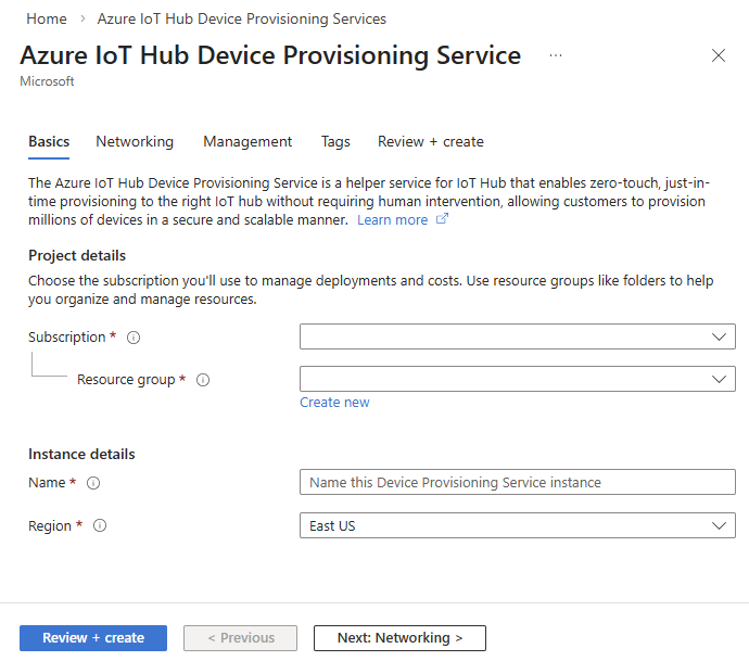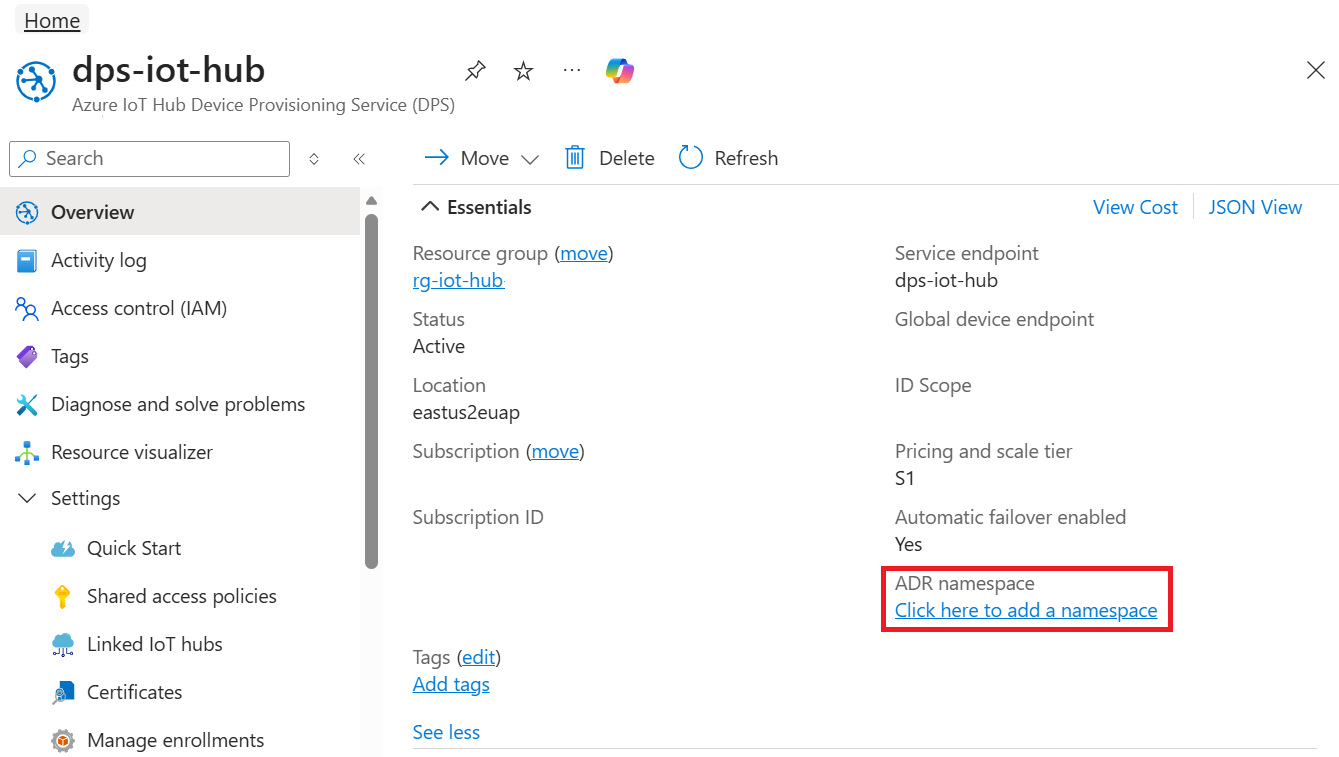 Utwórz nową instancję DPS połączoną z przestrzenią nazw ADR utworzoną w poprzednich sekcjach. Twoja instancja usługi Device Provisioning Service (DPS) musi być zlokalizowana w tym samym regionie co Twoja przestrzeń nazw ADR.
