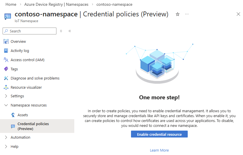 Na stronie przestrzeni nazw, w obszarze Zasoby przestrzeni nazw, wybierz pozycję Zasady poświadczeń (wersja zapoznawcza).
