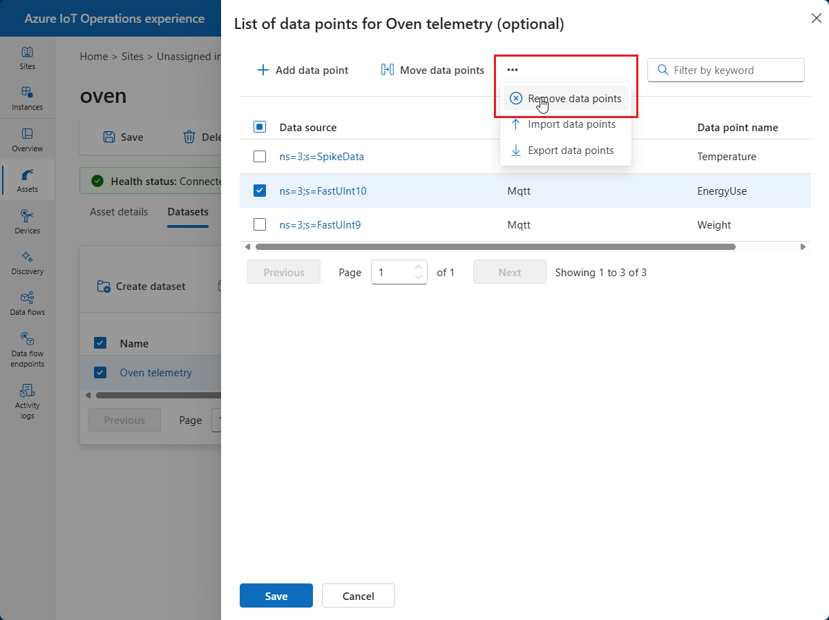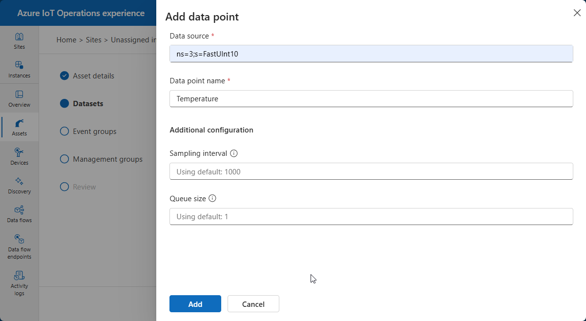 - Dodaj zasoby i zdefiniuj punkty danych i zdarzenia, aby umożliwić przepływ danych z serwerów OPC UA do brokera MQTT.