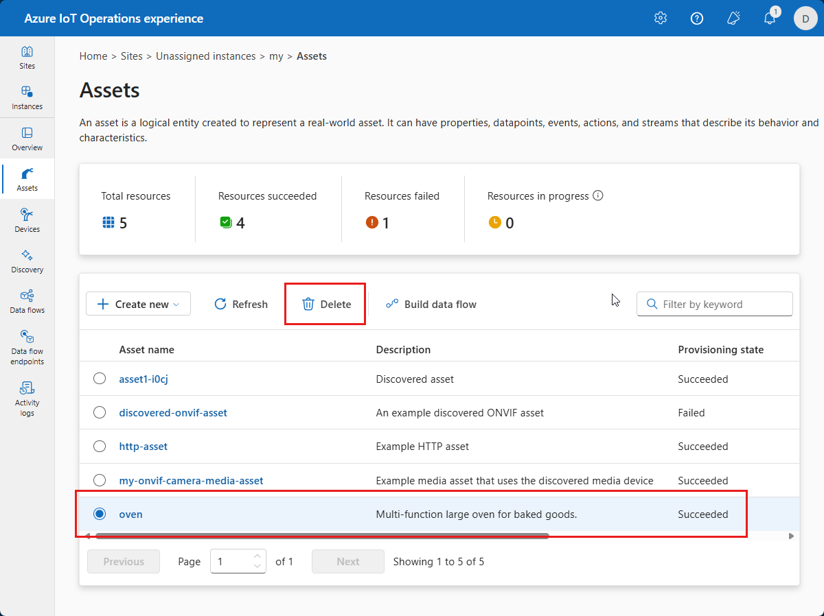 Aby usunąć zasób, wybierz zasób, który chcesz usunąć. Na stronie Szczegóły zasobu wybierz pozycję Usuń. Potwierdź zmiany w celu usunięcia elementu zawartości: