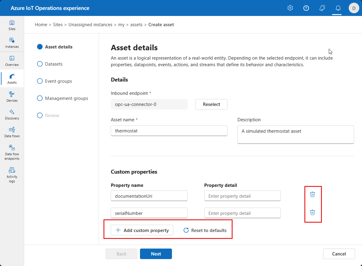 (No changes needed) Wartość Nazwa opc-ua-connector-0Łącznik dla adresu URL OPC UA opc.tcp://opcplc-000000:50000Uwierzytelnianie użytkownika AnonymousWybierz pozycję Dalej i na stronie Dodatkowe informacje wprowadź wszelkie właściwości niestandardowe dla urządzenia.