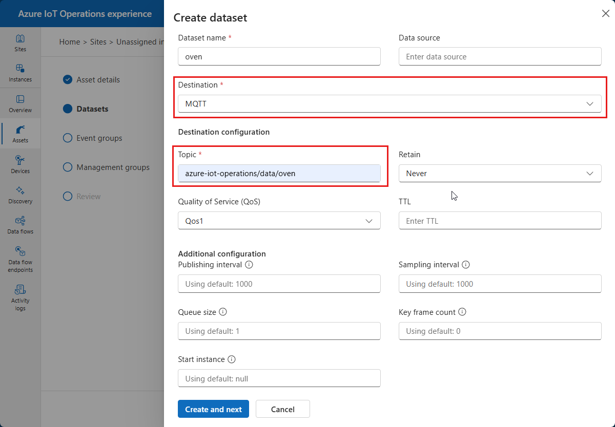 Wprowadź szczegóły zestawu danych, takie jak jego nazwa i miejsce docelowe. W przypadku zasobów OPC UA miejsce docelowe jest tematem MQTT. Przykład: