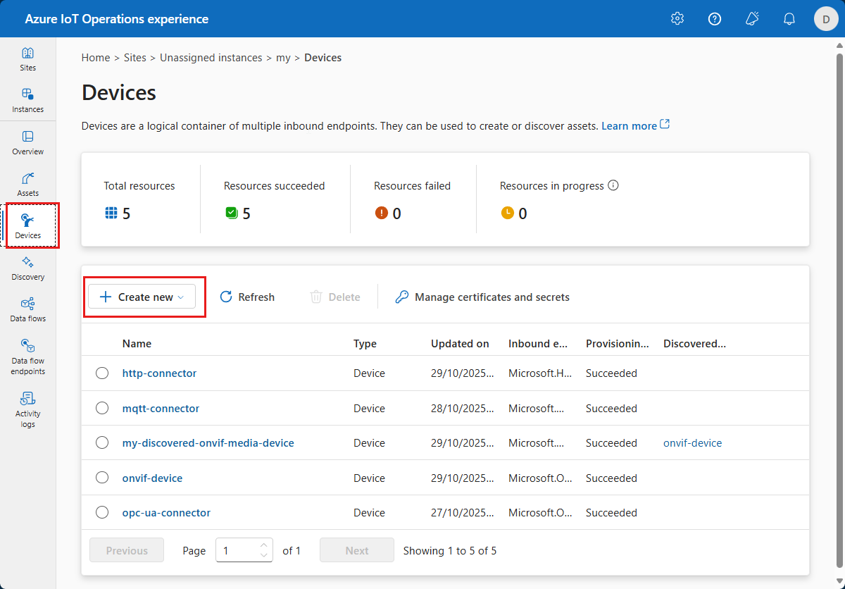Urządzenie w usłudze Azure IoT Operations to jednostka logiczna, która definiuje połączenia z fizycznymi elementami zawartości lub urządzeniami. Bez urządzenia dane nie mogą przepływać z urządzenia fizycznego ani zasobu do brokera MQTT. Podczas konfigurowania urządzenia i zasobu zostanie nawiązane połączenie z fizycznym zasobem lub urządzeniem i wartościami punktów danych, zdarzeniami i strumieniami przybywanymi do wystąpienia operacji usługi Azure IoT. Urządzenie ma co najmniej jeden przychodzący punkt końcowy. Operacje usługi Azure IoT przechowują definicje urządzeń w rejestrze urządzeń platformy Azure.