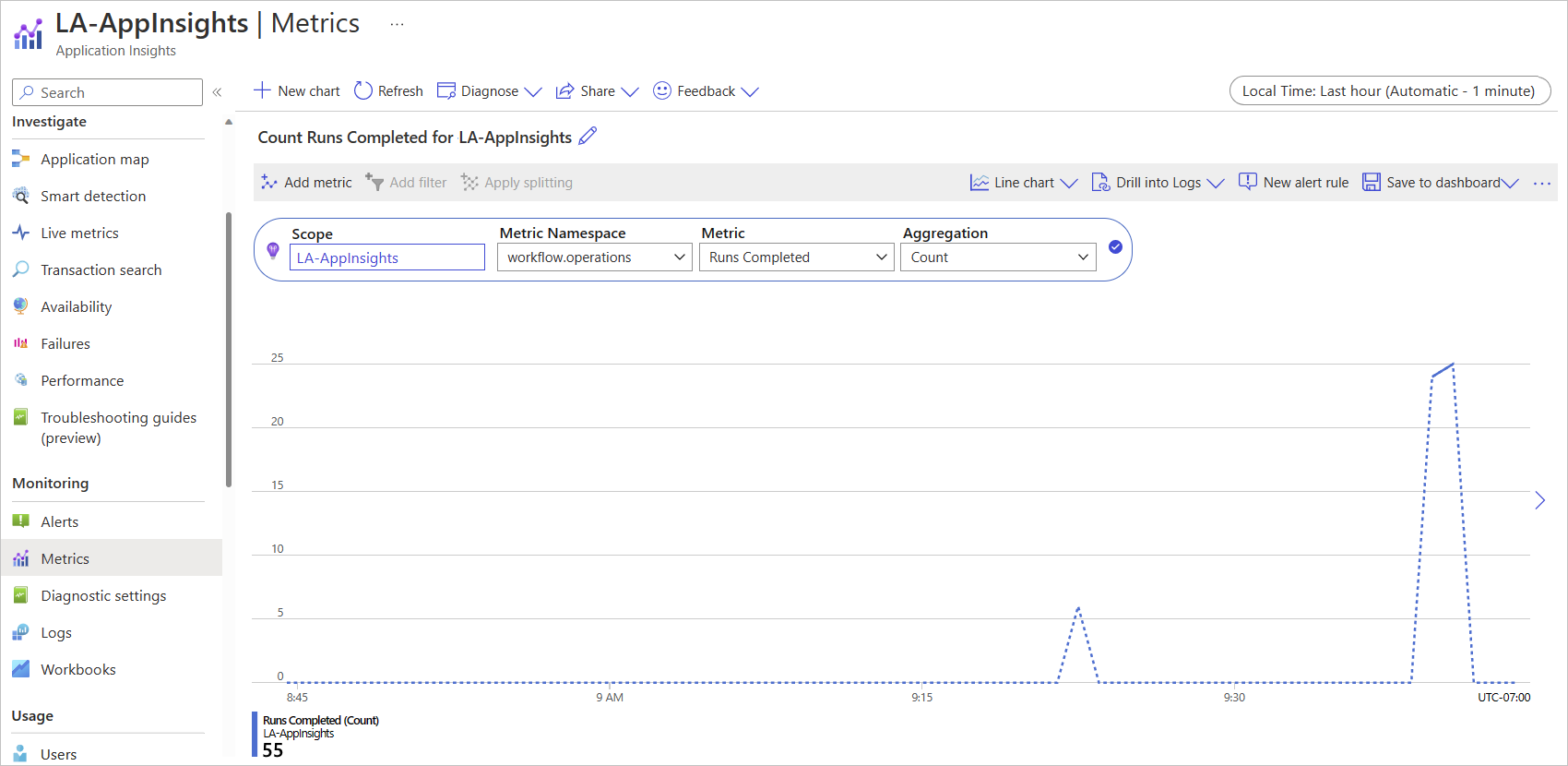 Z listy Przestrzeń nazw metryki wybierz pozycję workflow.operations.