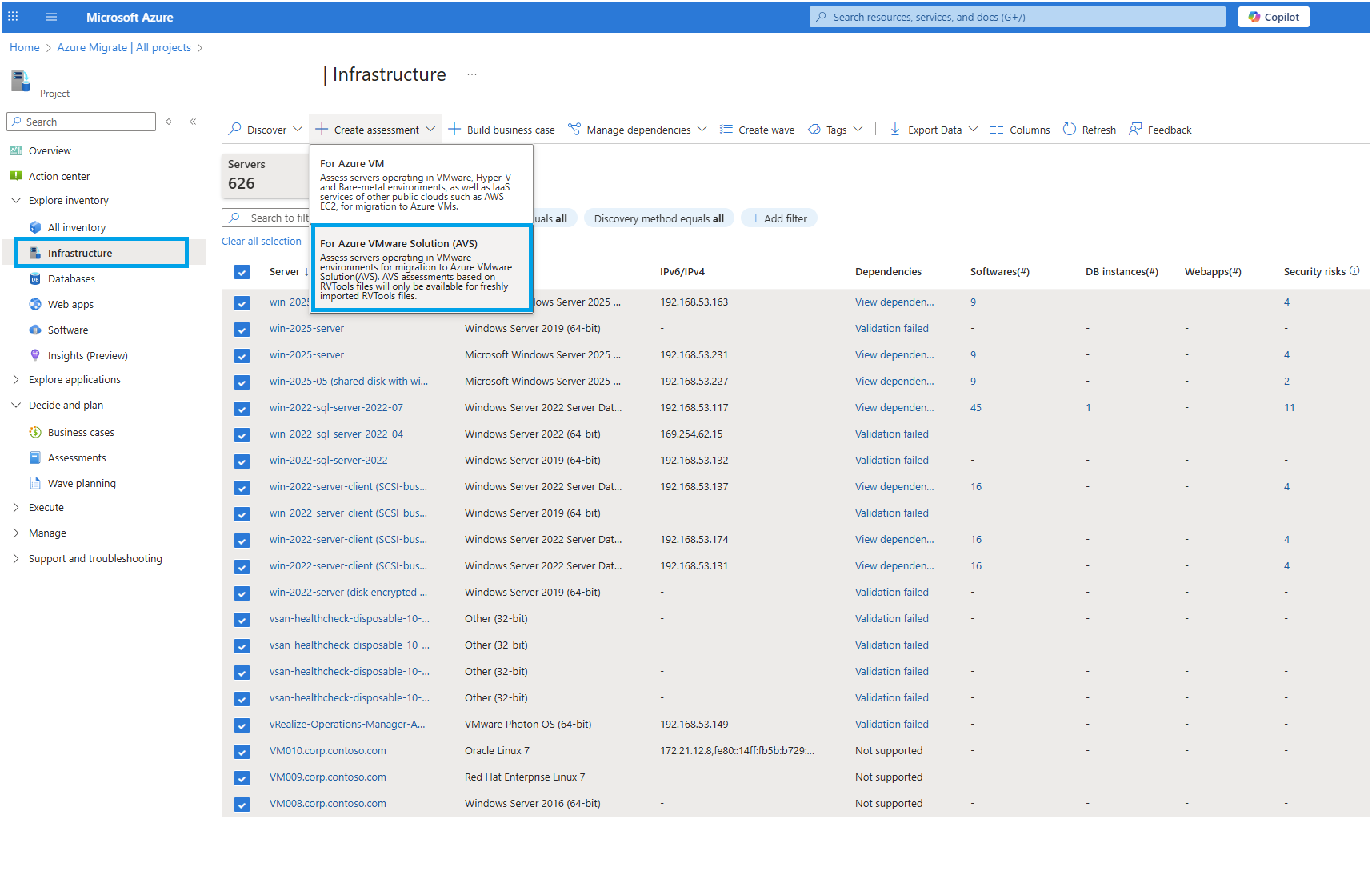 W górnym menu kliknij pozycję Utwórz ocenę z listy rozwijanej, wybierz pozycję Dla usługi Azure VMware Solution (AVS).