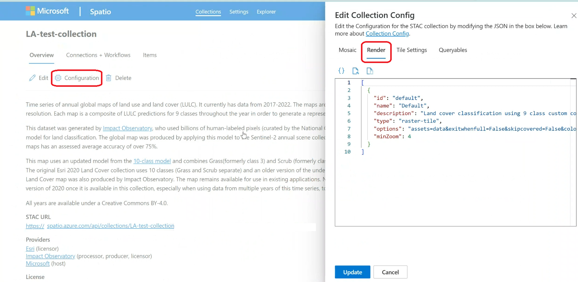 Przed kontynuowaniem upewnij się, że kod JSON kolekcji STAC zawiera tę sekcję. Definicję kolekcji można zaktualizować za pomocą interfejsu API lub interfejsu internetowego.