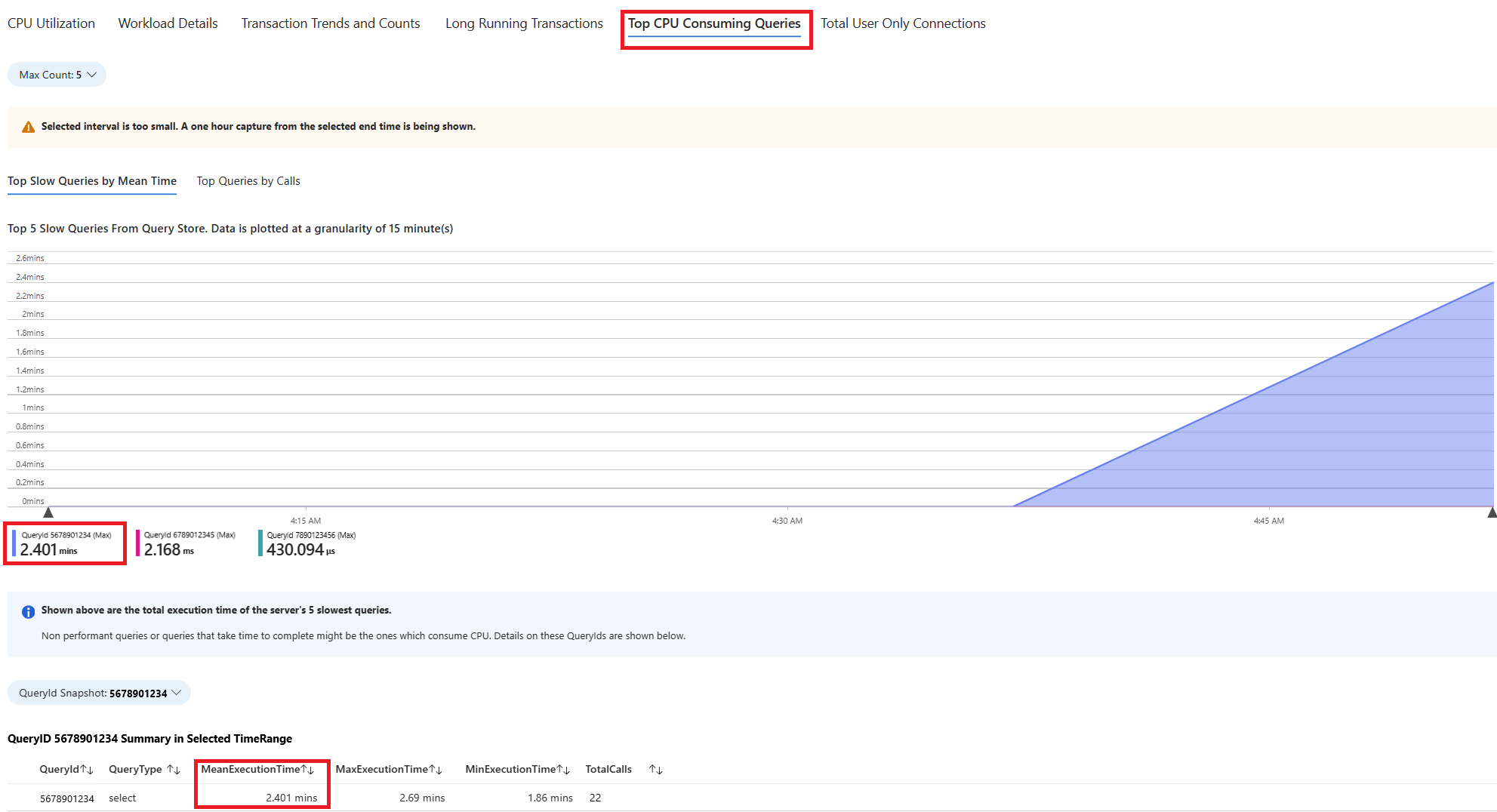 Wybierz kartę Zapytania . Zawiera on szczegółowe informacje o wszystkich zapytaniach uruchomionych w interwale, w którym zaobserwowano 90% użycia procesora CPU. Z migawki wygląda na to, że zapytanie o najwolniejszym średnim czasie wykonywania w interwale czasu wynosiło ok. 2,6 minut, a zapytanie zostało uruchomione 22 razy w interwale. To zapytanie jest najprawdopodobniej przyczyną skoków użycia procesora CPU.