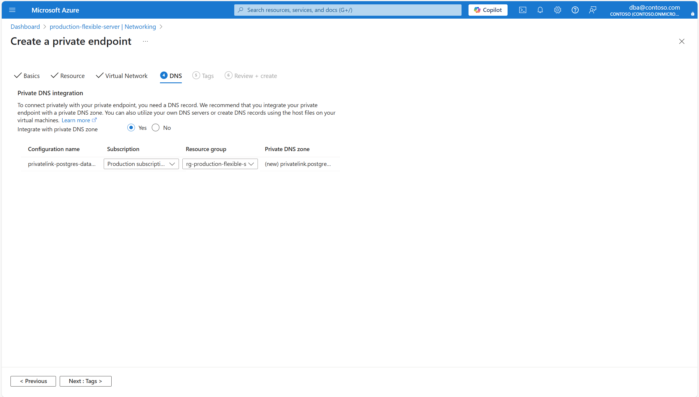 7. Na stronie DNS wypełnij wszystkie wymagane szczegóły. Następnie wybierz pozycję Dalej: Tagi.