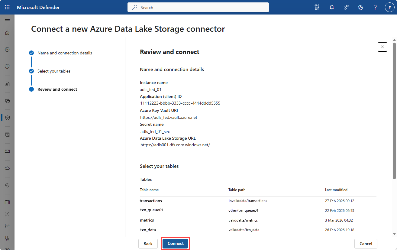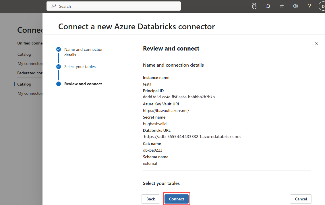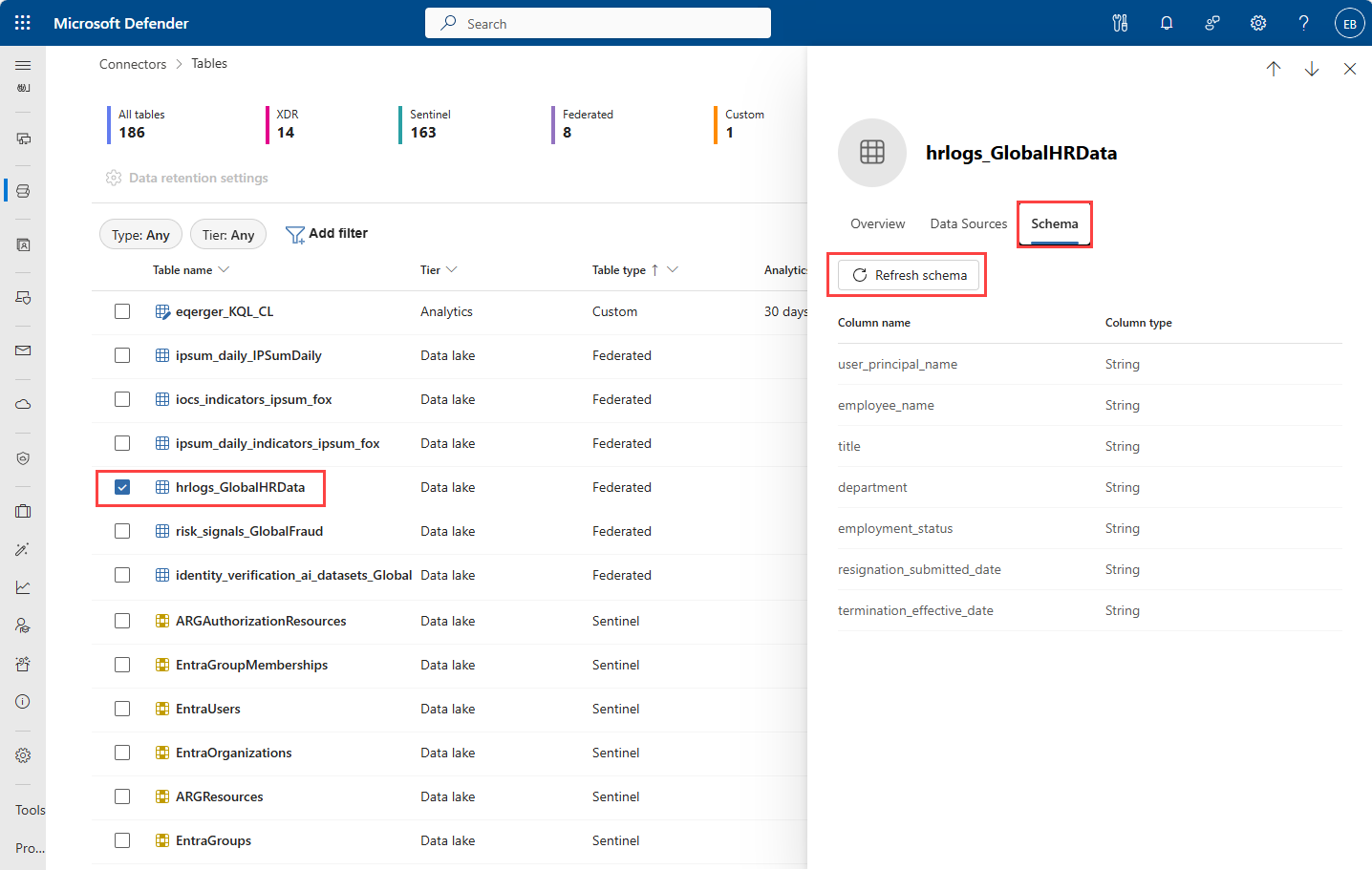 Po utworzeniu wystąpienia łącznika sprawdź, czy zafederowane tabele są dostępne w usłudze Microsoft Sentinel.