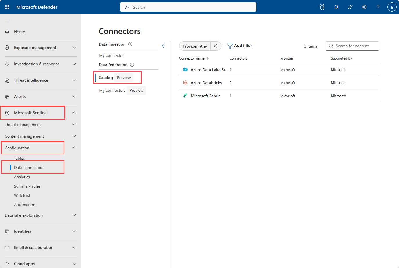 Łączniki federacyjne są zarządzane na stronie Łączniki danych w usłudze Microsoft Sentinel w portalu usługi Defender.