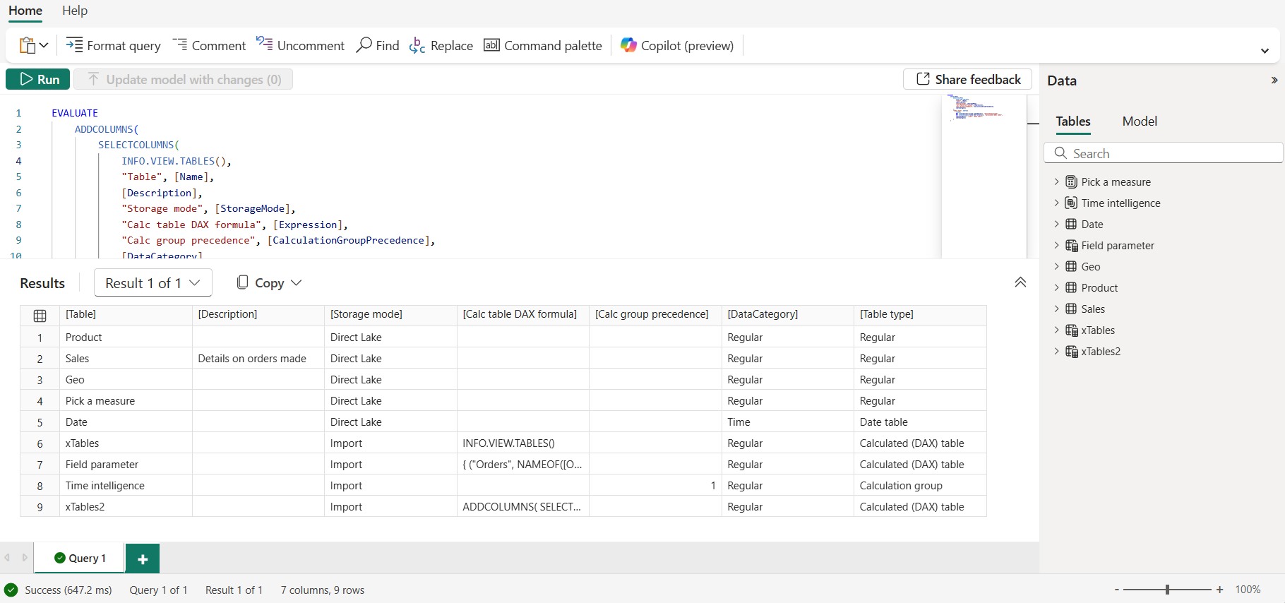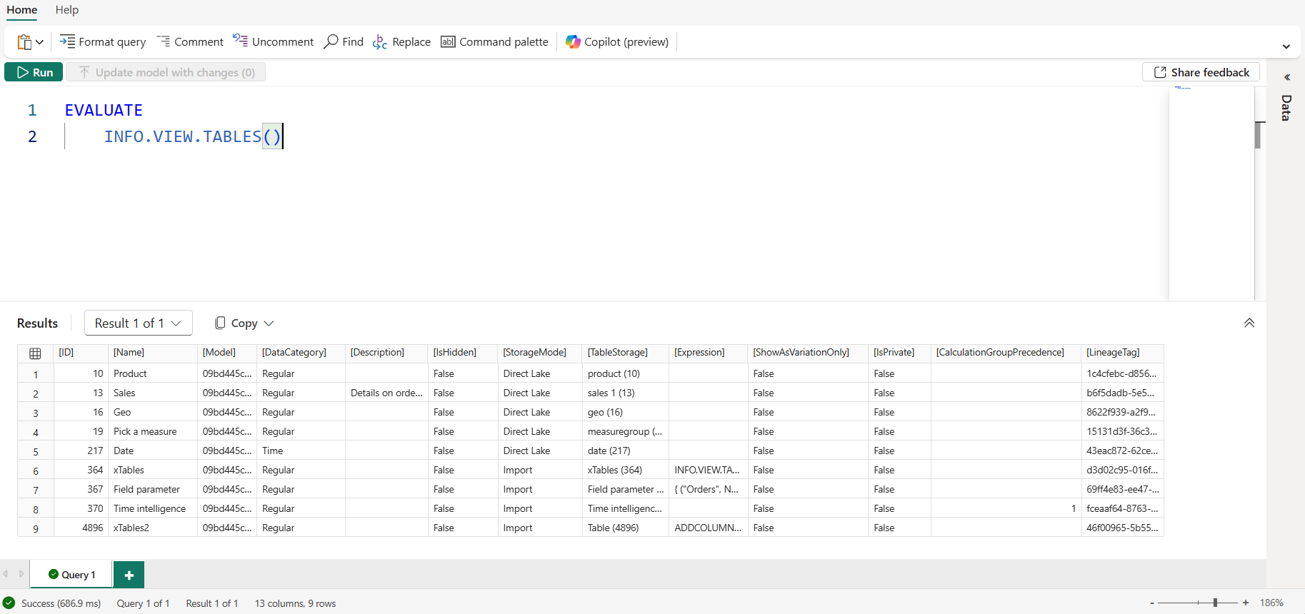 Zwraca tabelę z informacjami o każdej tabeli w modelu semantycznym, takim jak nazwa tabeli, opis i tryb przechowywania. Te informacje pomagają zrozumieć model i samodzielnie udokumentować model w przypadku użycia w tabelach obliczeniowych.