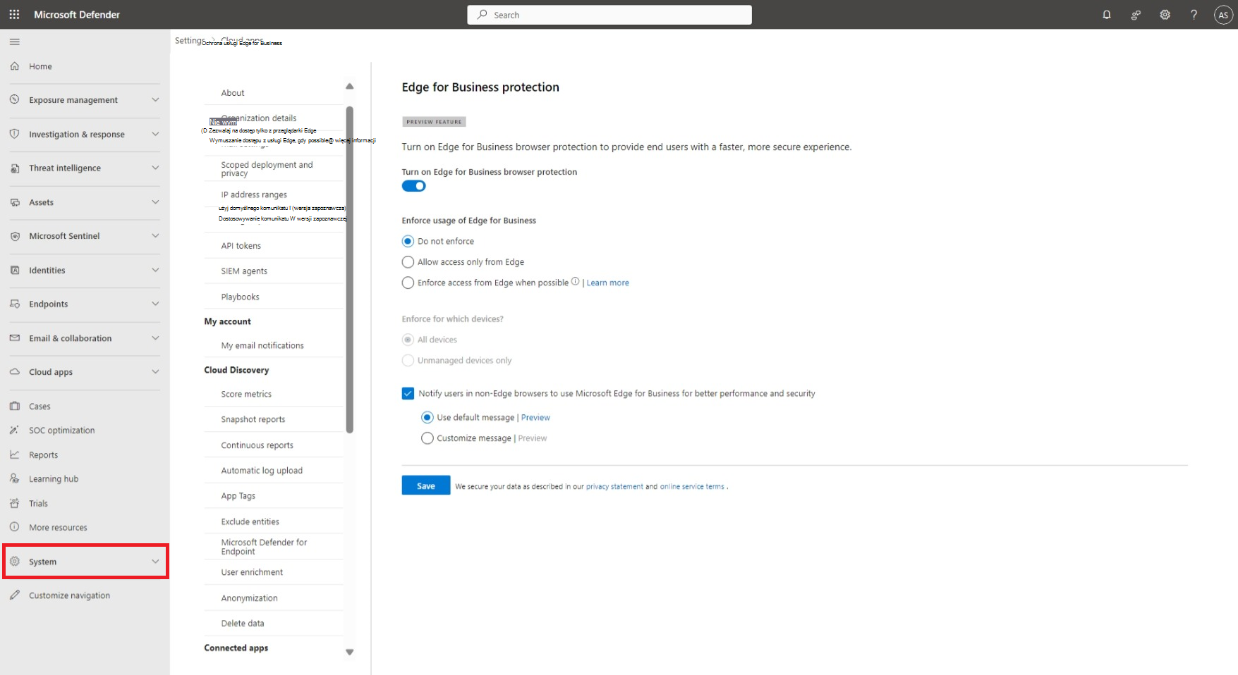 W portalu Microsoft Defender pod adresem https://security.microsoft.comprzejdź do sekcji >Ustawienia>systemu>Aplikacje> w chmurzeKontrola dostępu warunkowego aplikacjiEdge for Business Protection. Aby przejść bezpośrednio do strony ochrony usługi Edge for Business , użyj polecenia https://security.microsoft.com/cloudapps/settings?tabid=edgeIntegration.
