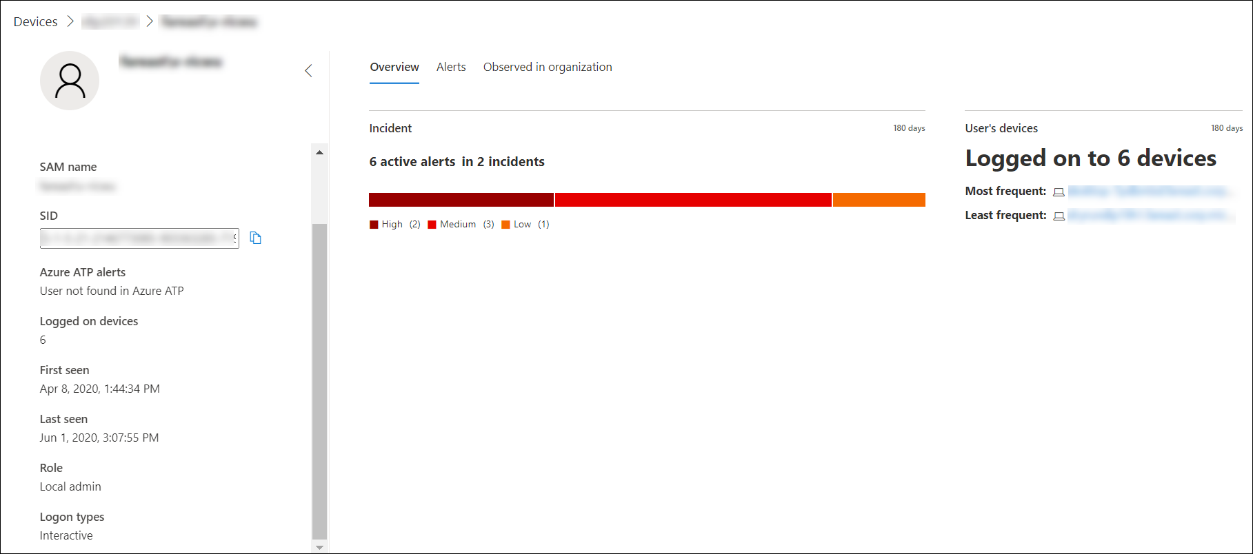 - Szczegóły konta użytkownika, alerty Microsoft Defender for Identity i zalogowane na urządzeniach, rola, typ logowania i inne szczegóły