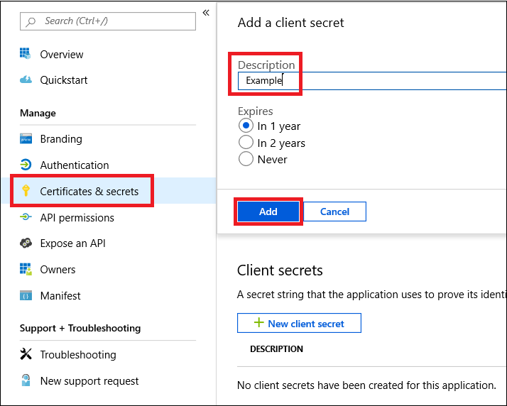 Aby dodać wpis tajny do aplikacji, wybierz pozycję Certyfikaty & wpisów tajnych, dodaj opis do wpisu tajnego, a następnie wybierz pozycję Dodaj.
