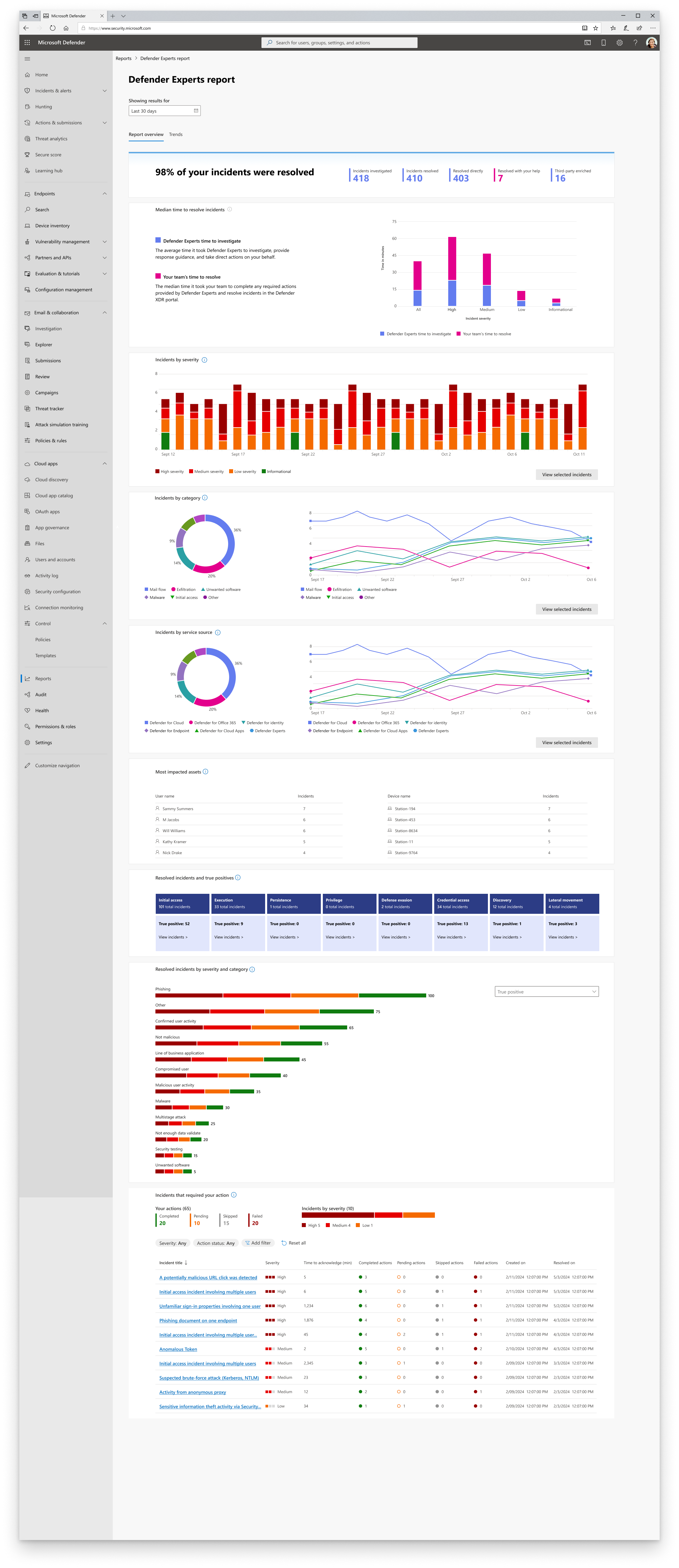 Eksperci usługi Microsoft Defender w zakresie XDR zawiera interaktywny raport na żądanie, który zawiera jasne podsumowanie pracy wykonywanej przez naszych ekspertów analityków w Twoim imieniu, zagregowane informacje o krajobrazie zdarzenia oraz szczegółowe informacje o konkretnych zdarzeniach. Menedżer dostarczania usług (SDM) używa również raportu, aby zapewnić więcej kontekstu dotyczącego usługi podczas comiesięcznego przeglądu biznesowego.