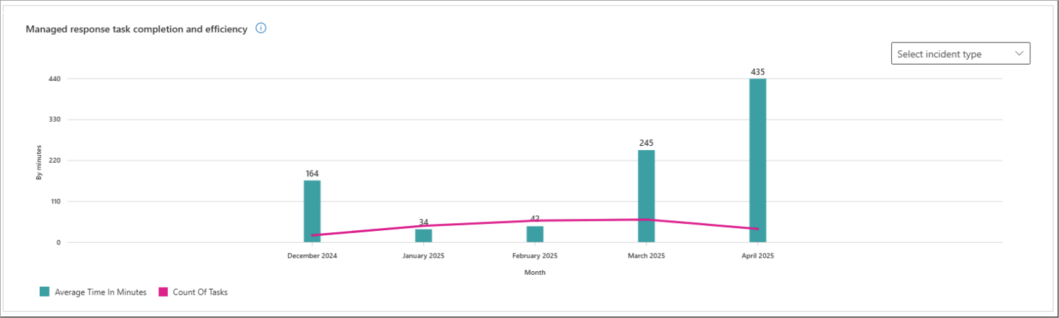 Na karcie Trendy znajduje się również widżet kończenie i wydajność zadania zarządzanej odpowiedzi , który pokazuje miesięczną liczbę zarządzanych zadań odpowiedzi wykonywanych przez zespół każdego miesiąca wraz z medianą czasu, jaki zajęło twojemu zespołowi wykonanie tych zadań. Ten widżet pomaga zidentyfikować wszelkie skoki skuteczności i wydajności reakcji zespołu, co jest coraz ważniejsze, ponieważ osoby atakujące nadal skracają czas między początkowym dostępem a ruchem poprzecznym.