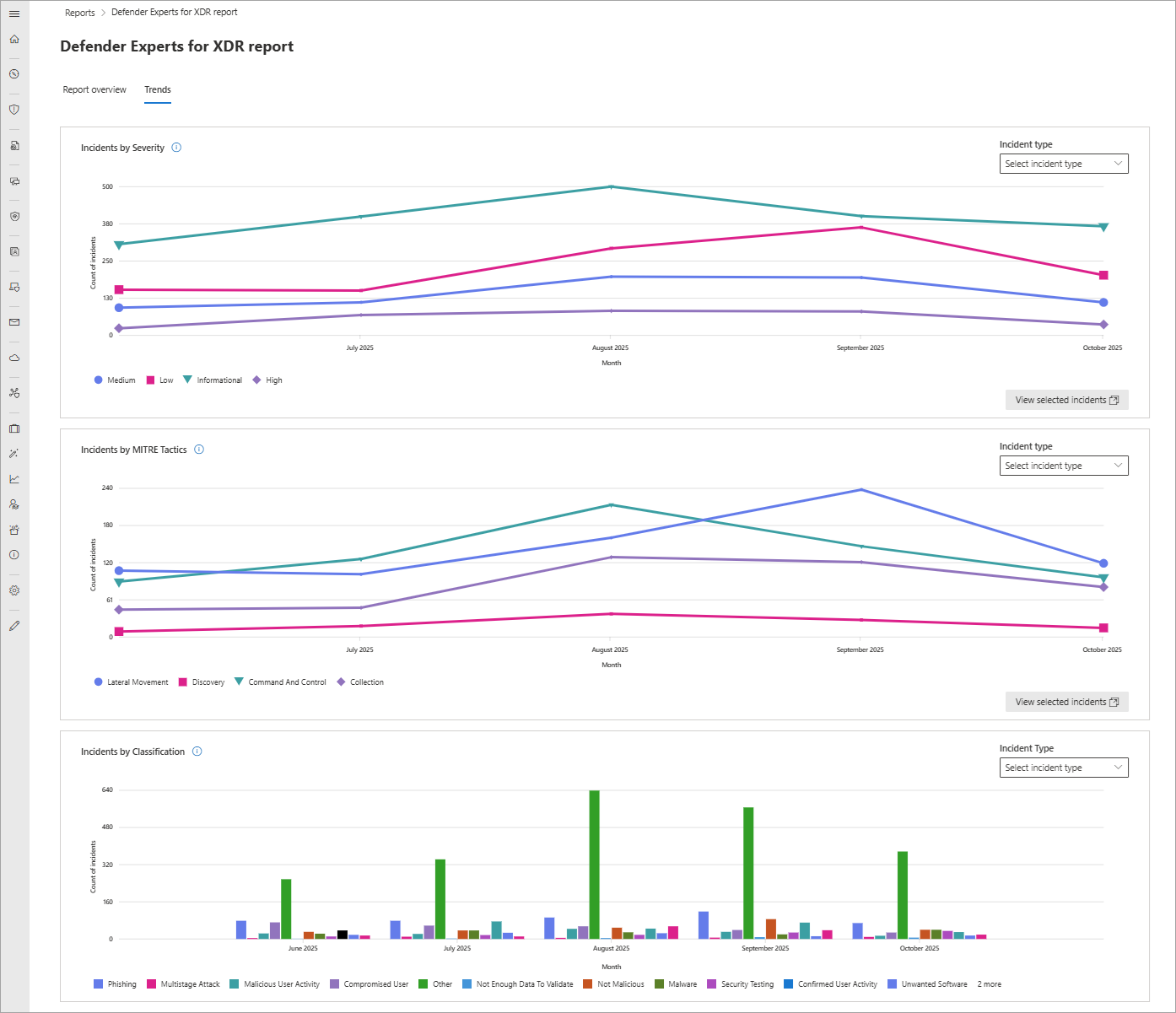 Karta Trendy raportu zawiera comiesięczną liczbę badanych i rozwiązanych zdarzeń z ostatnich sześciu miesięcy, wizualizowanych zgodnie z ważnością, taktyką MITRE i typem zagrożenia. Sekcja trendów zawiera szczegółowe informacje na temat tego, jak eksperci usługi Defender tangibly poprawiają operacje zabezpieczeń, pokazując ważne metryki operacyjne z miesiąca na miesiąc.