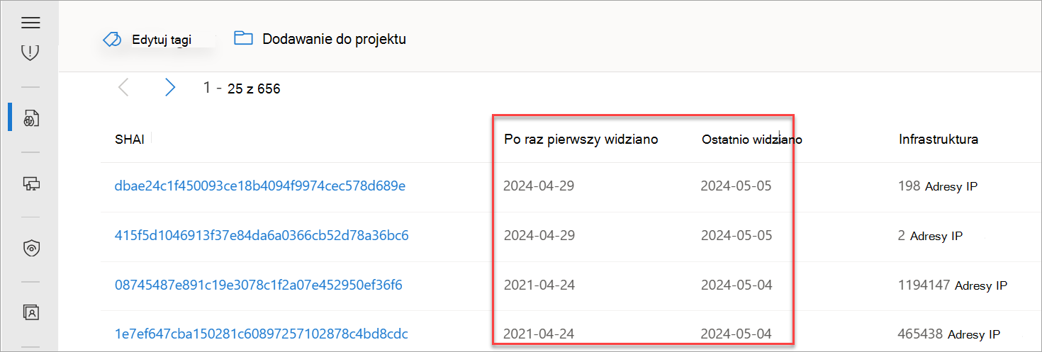 - Ostatnio zeskanowane: Data ostatniego skanowania rekordu przez system TI usługi Defender