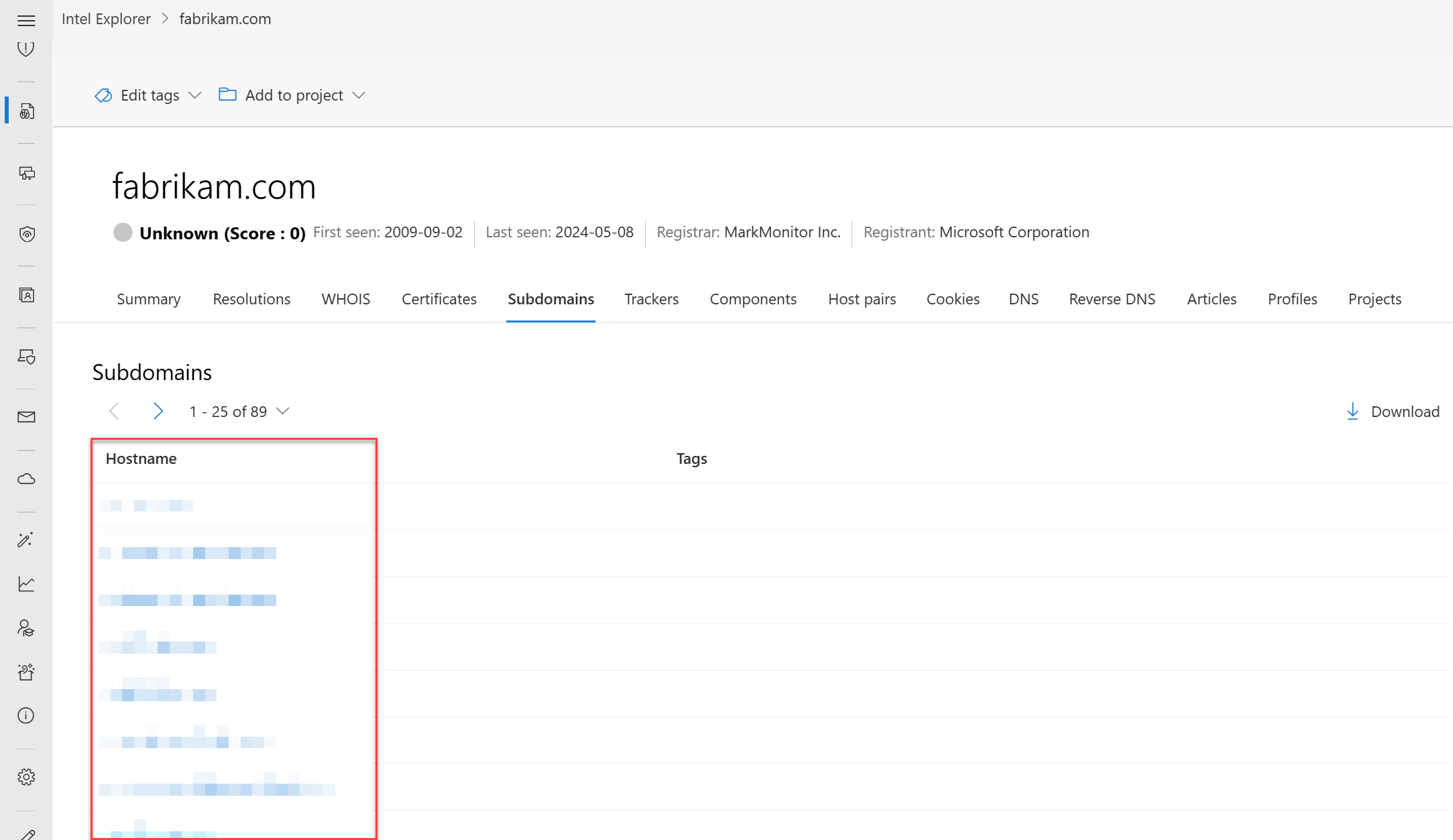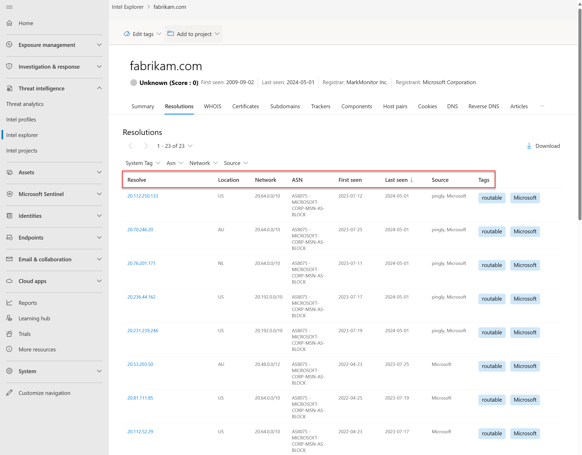Usługa PDNS może umożliwić identyfikację wcześniej nieznanej lub nowo utworzonej infrastruktury aktora zagrożeń. Proaktywne dodawanie wskaźników do list zablokowanych może odciąć ścieżki komunikacyjne przed rozpoczęciem kampanii. Dane rozpoznawania rekordów są dostępne na karcie Rozdzielczości, która znajduje się na stronie eksploratora intela w portalu Microsoft Defender. Więcej typów rekordów DNS są dostępne na karcie DNS .