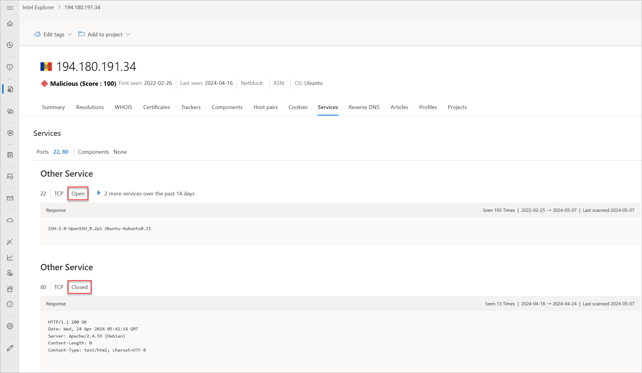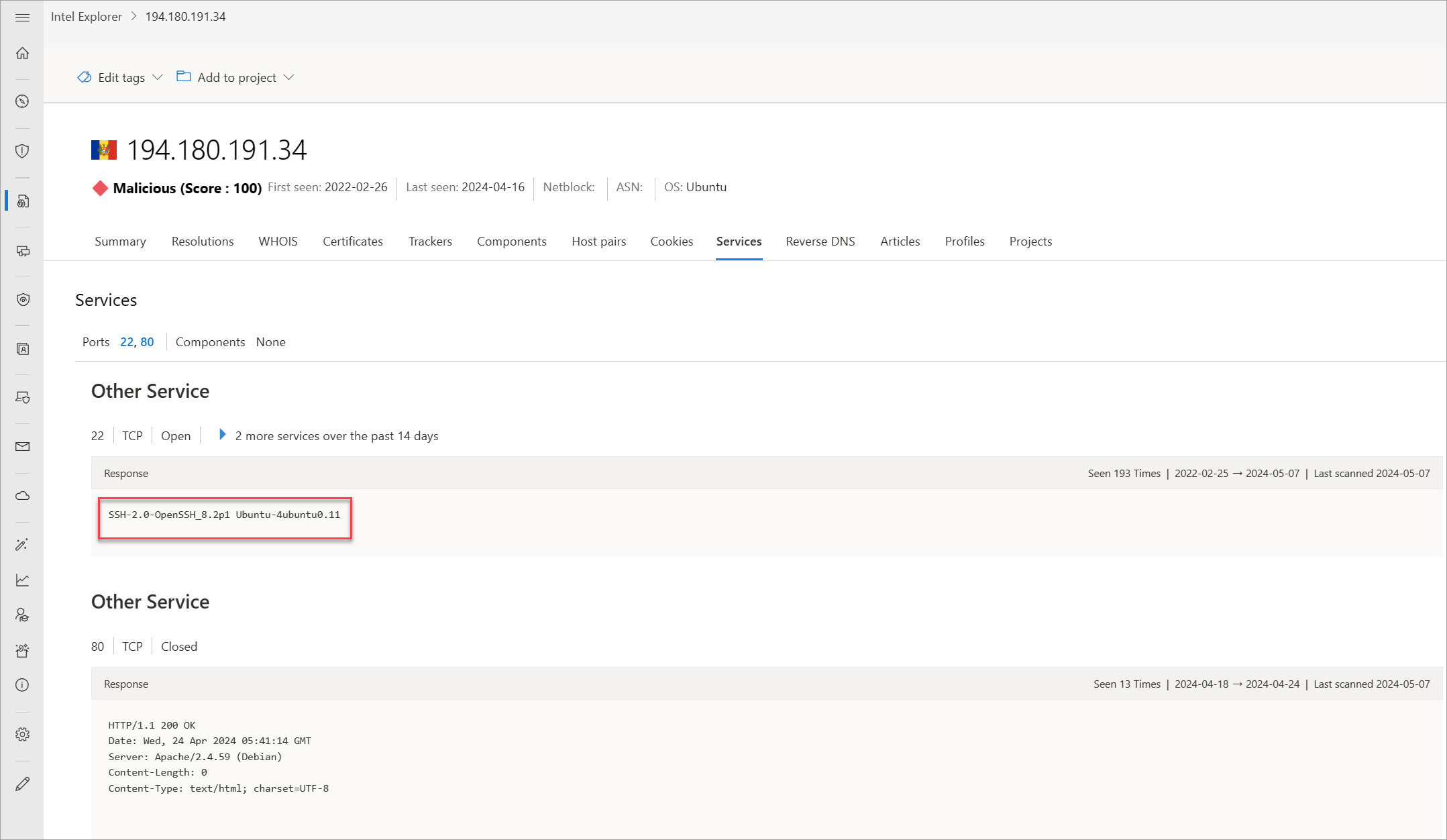 Nazwy usług i numery portów służą do rozróżniania różnych usług uruchamianych za pośrednictwem protokołów transportowych, takich jak TCP, UDP, DCCP i SCTP. Numery portów mogą sugerować typ aplikacji uruchomionej na określonym porcie. Jednak aplikacje lub usługi można zmienić tak, aby używały innego portu do zaciemniania lub ukrywania aplikacji lub usługi na adresie IP. Znajomość informacji o porcie i nagłówku/banerze może identyfikować prawdziwą aplikację/usługę oraz kombinację używanych portów. Usługa Defender TI wyświetla 14 dni historii na karcie Usługi , wyświetlając ostatnią odpowiedź baneru skojarzoną z zaobserwowanym portem.