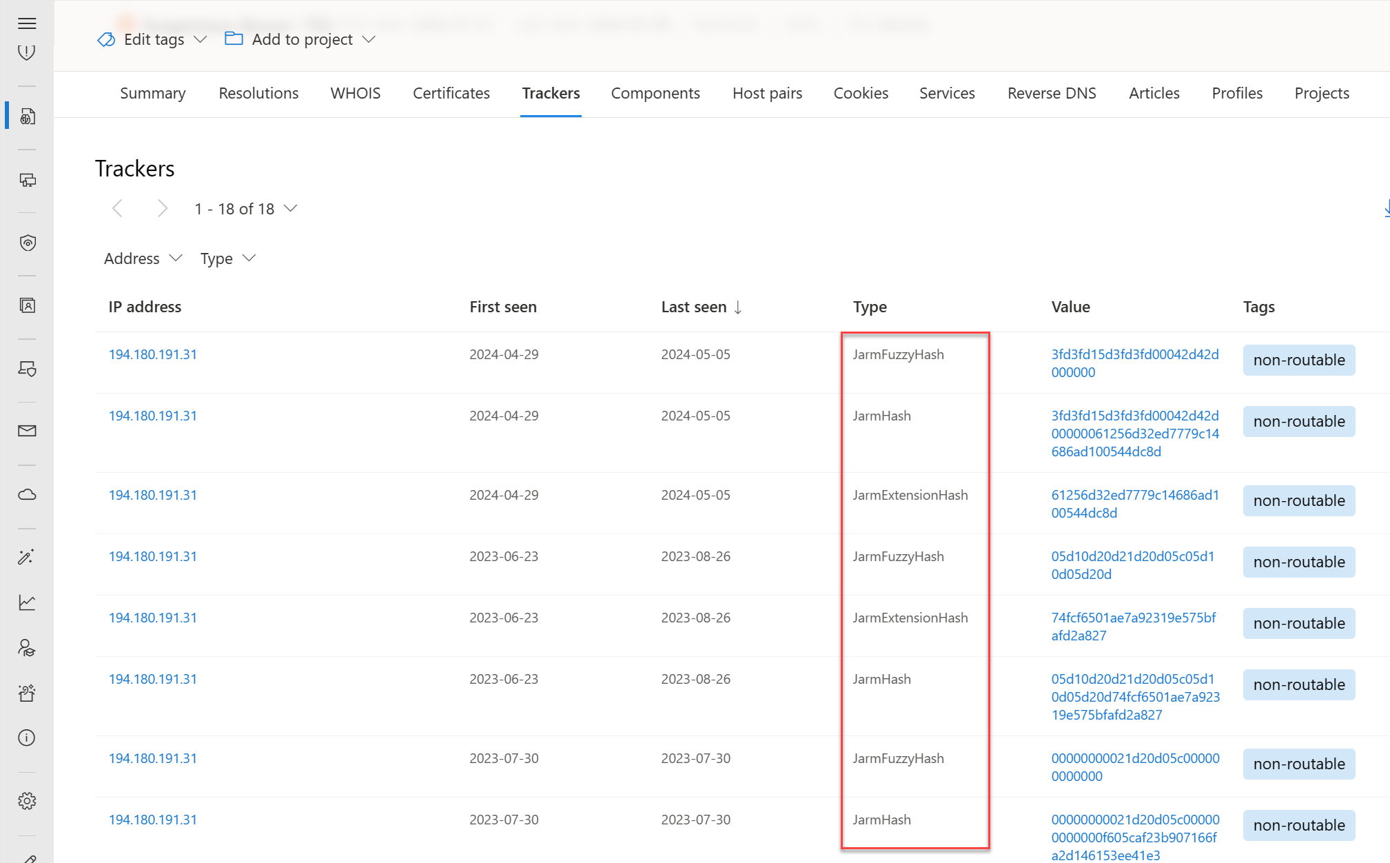 Certyfikaty TLS to pliki, które cyfrowo wiążą klucz kryptograficzny z zestawem szczegółów dostarczonych przez użytkownika. Usługa Defender TI używa technik skanowania internetowego do zbierania skojarzeń certyfikatów protokołu TLS z adresów IP na różnych portach. Te certyfikaty są przechowywane w lokalnej bazie danych i umożliwiają nam utworzenie osi czasu, w której dany certyfikat TLS pojawił się w Internecie.