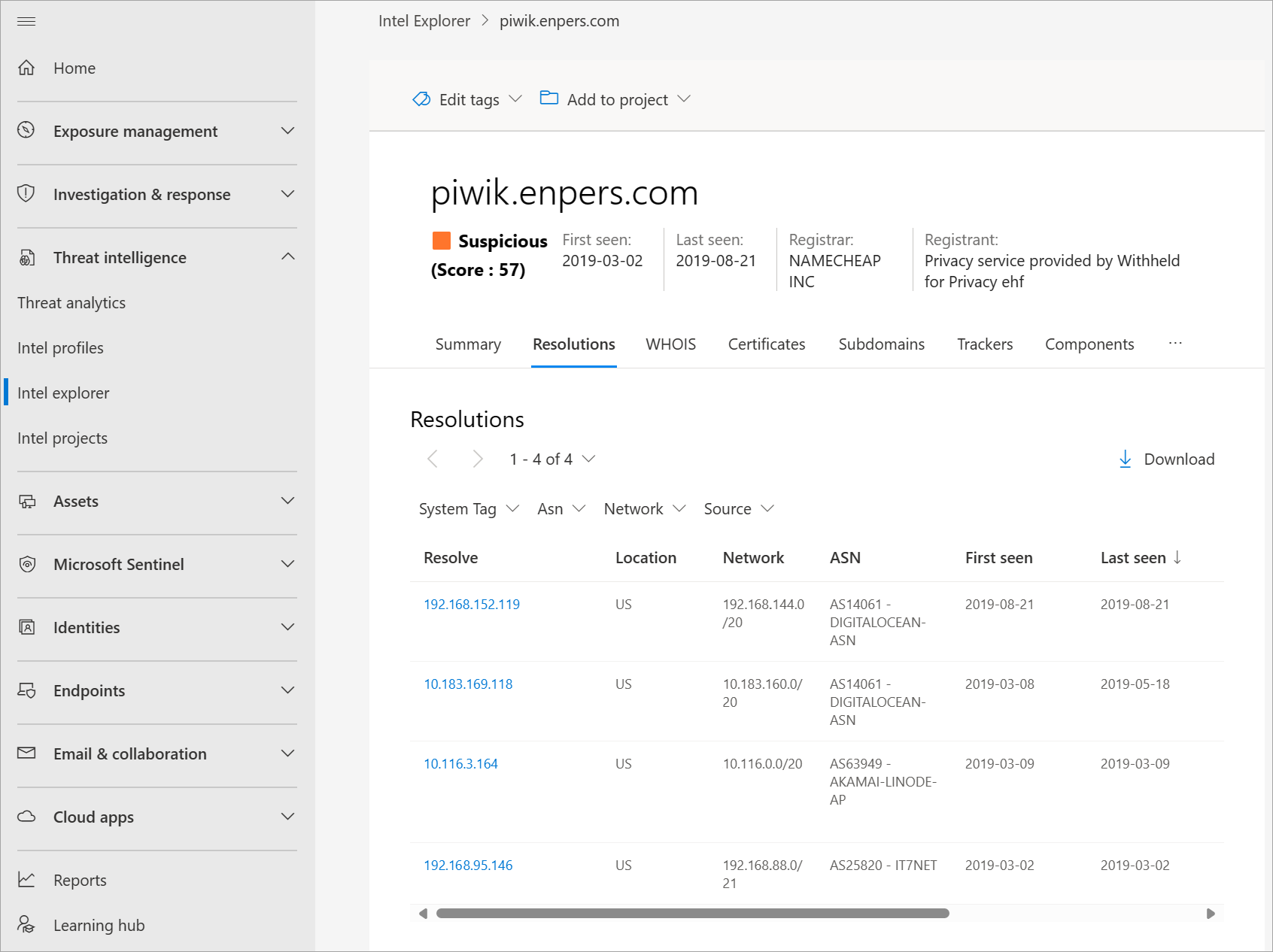 - Przejdź doeksploratora intelaanalizy> zagrożeń.