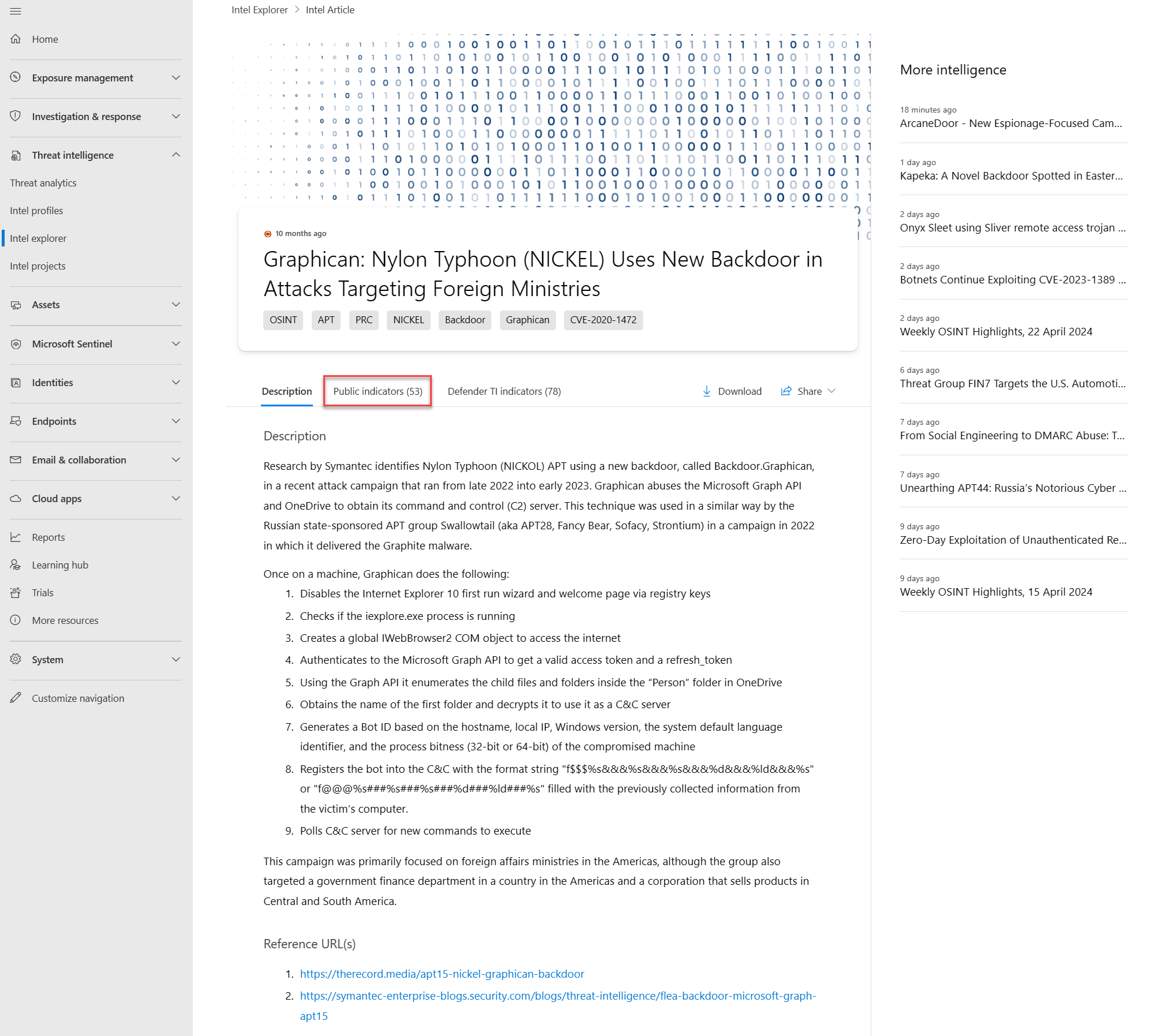 Wybierz kartę Artykuły pokrewne profilu, a następnie wybierz artykuł Graphican: Nylon Typhoon (NICKEL) Uses New Backdoor in Attacks Targeting Foreign Ministries (Graficzny: Nylon Typhoon (NICKEL) Używa nowego tylnego wejścia w atakach ukierunkowanych na ministerstwa spraw zagranicznych.