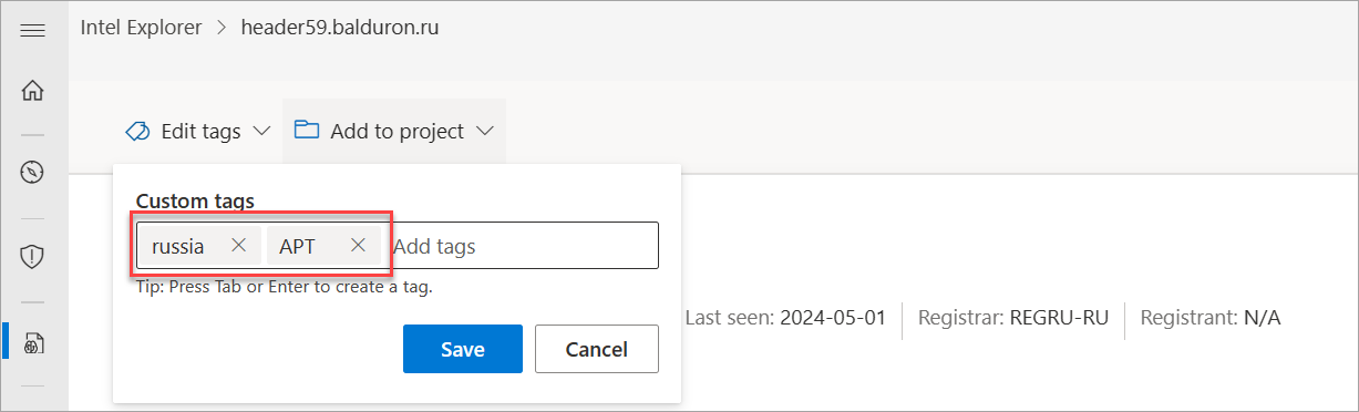 Tagi niestandardowe wprowadzają kontekst do wskaźników naruszenia zabezpieczeń (IOCs) i jeszcze bardziej ułatwiają analizę, identyfikując te domeny, które są znane źle z publicznego raportowania lub które zostały skategoryzowane jako takie. Tagi te są tworzone ręcznie na podstawie własnych badań, a tagi te umożliwiają udostępnianie kluczowych szczegółowych informacji o artefaktach innym użytkownikom licencji usługi Defender TI w ramach dzierżawy.